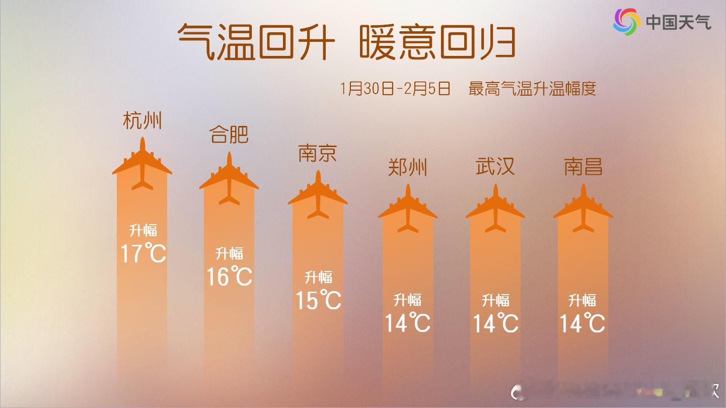 【2月初大回暖】今明因为冷空气和阴雨雪,使得黄淮到江南多地,天气湿冷。但在冷空气影响过后,气温将大幅回升。不少城市累积升温会超15℃。2月4日立春,郑州、合肥、武汉、南京、杭州、长沙最高气温在18℃上下,能感受到初春的气息。
