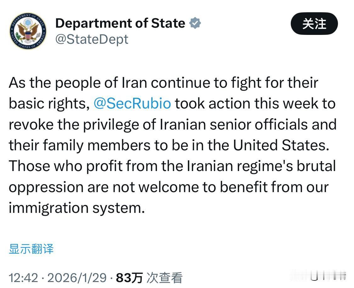 美国国务院周四在X网站上发布消息称,美国已取消伊朗高级官员及其家属的入境特权。声明未透露受影响人员的具体范围以及该措施何时生效。