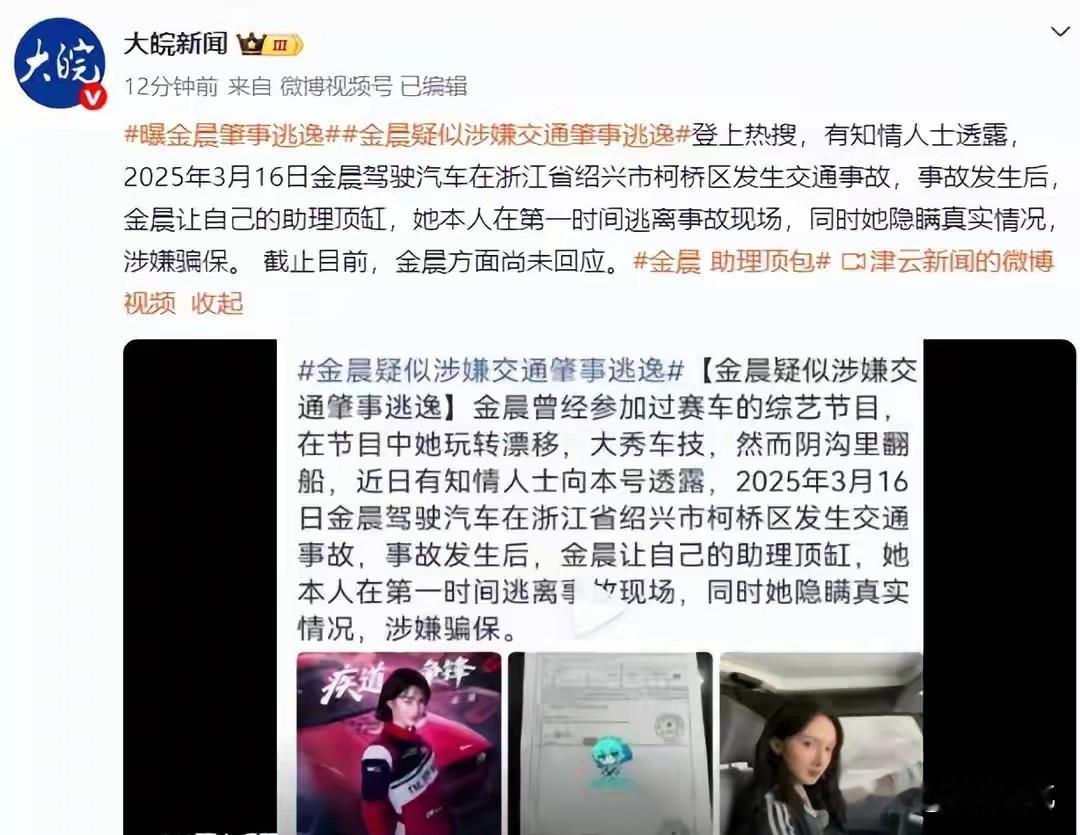 都这个身价了,确实不应该! 有点看不懂了,女星金晨被曝交通肇事逃逸,并让他人顶包,既没有撞到人,自己也没有受伤,只是修车就完事了,花个几万块钱就搞定了,为啥要走保险呀? 这下倒好,保险一查监控顶包的事就暴露了,幸亏影响力比较大,保险公司在接到金晨的要求之后撤销了报案,要不然还得吃官司。
