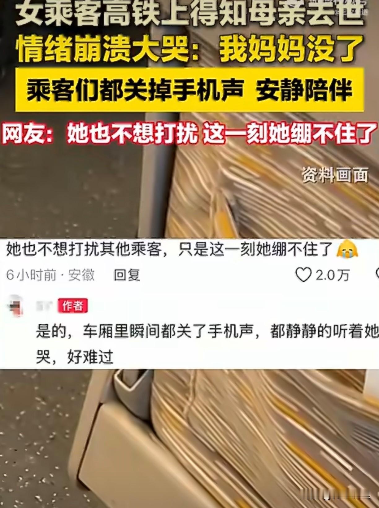 遇到这样的事情,无论谁怕都是会忍不住大哭吧。 看到安徽网友发布的一条视频,在一列高铁上,一名女乘客在接到电话后,崩溃大哭,哭喊着:“我妈妈没了”。这一刻,整个车厢瞬间静默,没有人大声聊天了,也没有人外放视频了,都在默默的陪着这名女乘客。乘务员了解事情经过后,也赶紧过来安慰她。 想必这名女子在了解的妈妈的状况后,紧赶着回家,想着见妈妈最后一面,可是却没有赶上,这种扎心的痛,大概就是心被生生剜去一块的感觉吧,想想就让人揪心。世间最痛的莫过于永失至情。希望这名女子带着妈妈的爱,慢慢走过这段最难的路。