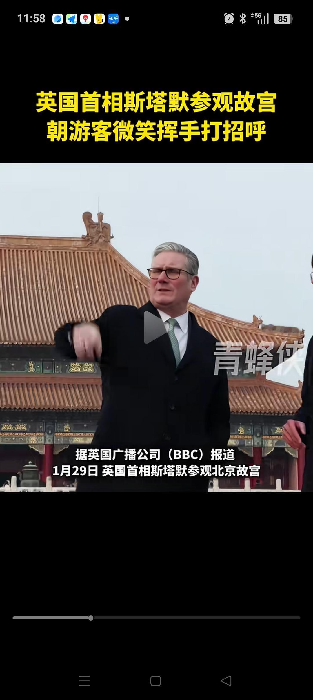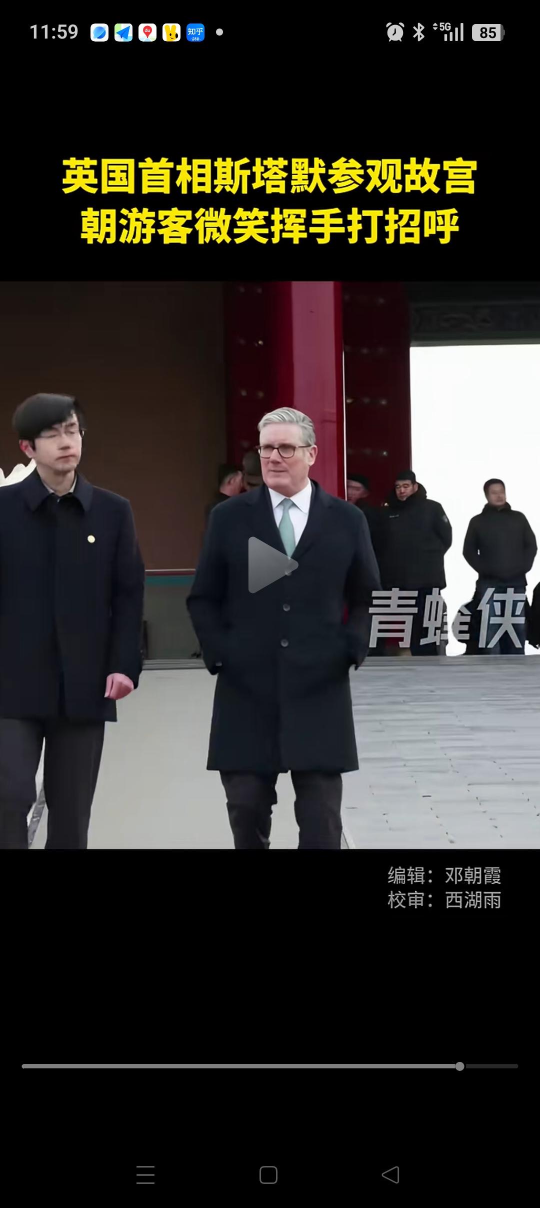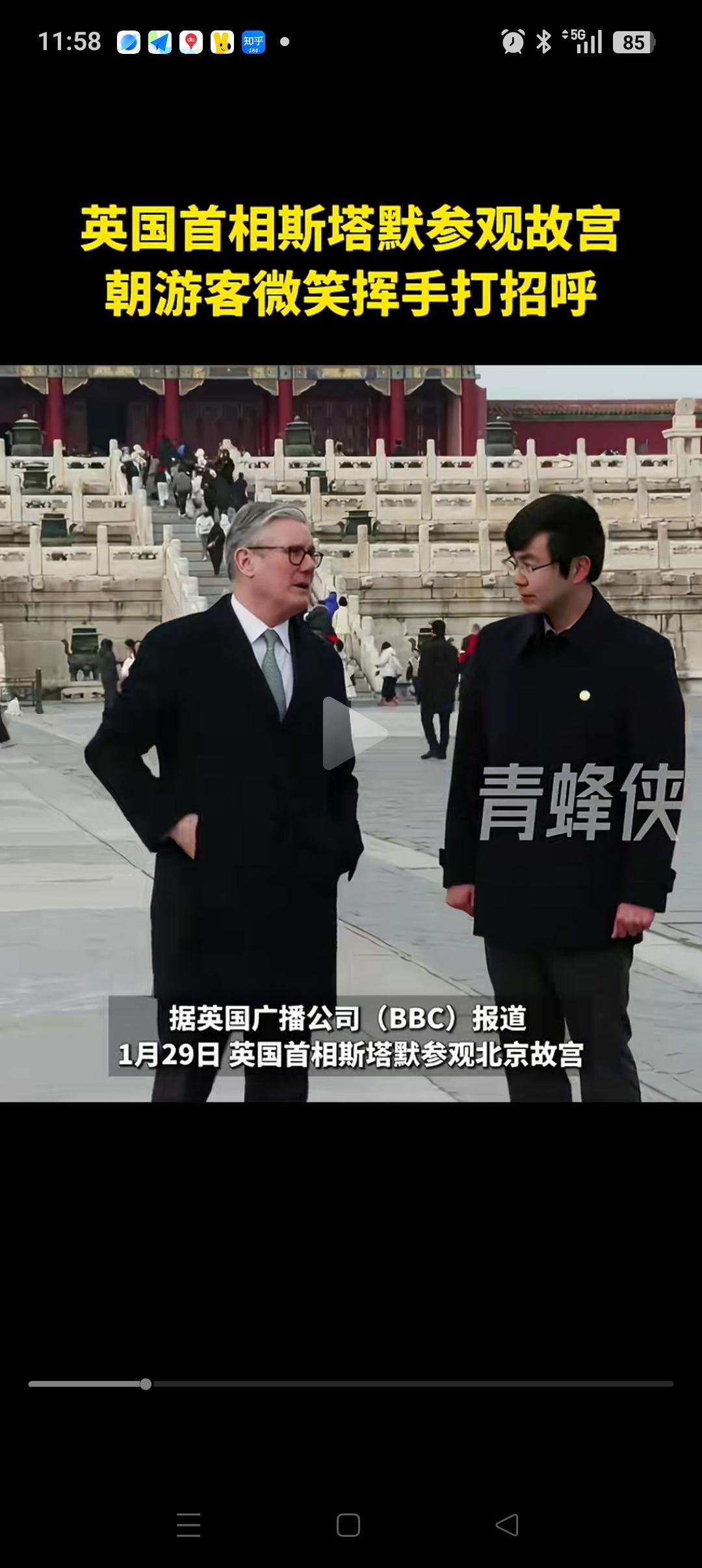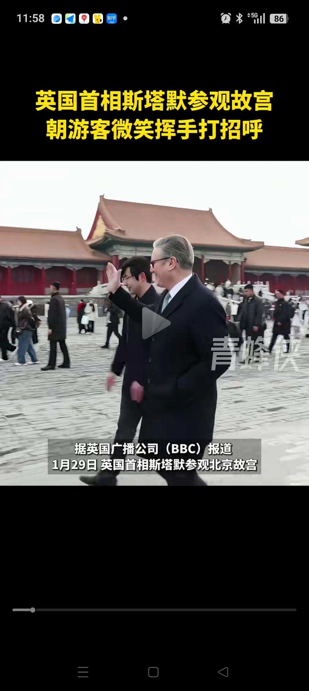 斯塔默参观故宫,3个细节,尽显低调: 1、现场除了一名讲解人员,并没有别的人员陪同:说明他只是想好好的参观故宫,人多了有时候不能静下心来默默感受,不得不说他太明智了 2、现场的游客依然在旅游,并没有清场。当游客和他打招呼时,他也热情的挥手打招呼,没有一点架子。 3、当讲解员认真给他讲解历史时,他不仅听的很认真,还时不时的提出问题。显然是真的听进去了,特别感兴趣