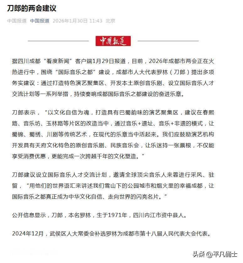 作为人大代表刀郎的提案,对于成都这座城市非常实用。在出席成都市人大会期间,刀郎带来了自己的提案,围绕打造“国际音乐之都”,建设特色演绎聚集区,推进人才培养、音乐交流等一系列活动,通过“音乐+遗址”“音乐+非遗”等模式,让传统文化活起来。 看见了吧!专业人提的提案都很专业,成都要打造“国际音乐之都”,就要让刀郎发挥出巨大作用。看看刀郎每一次演唱会的盛况就知道,刀郎在歌迷群体中的号召力。只要刀郎的提案能够得到落实,你应该相信,成都的文化号召力一定能够超越绝大多数城市。而有了人的关注,像蜀绣、川剧这些传统文化也就能再次绽放光彩。我们应该羡慕成都有刀郎,成都的文化产业必然有非凡的创造力和影响力。