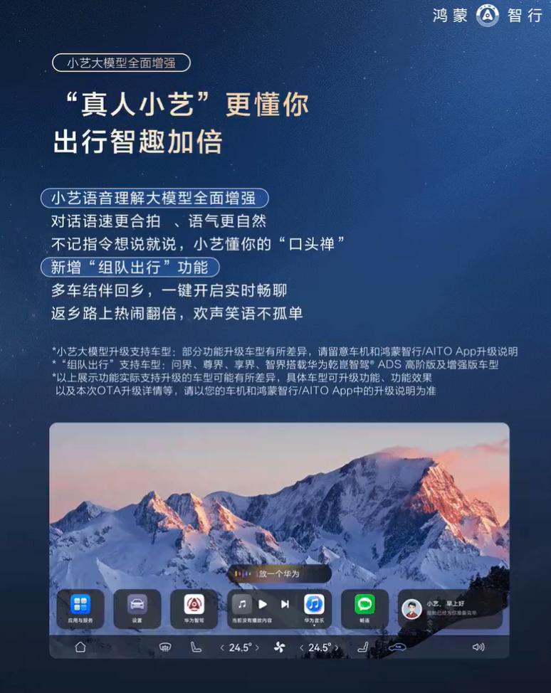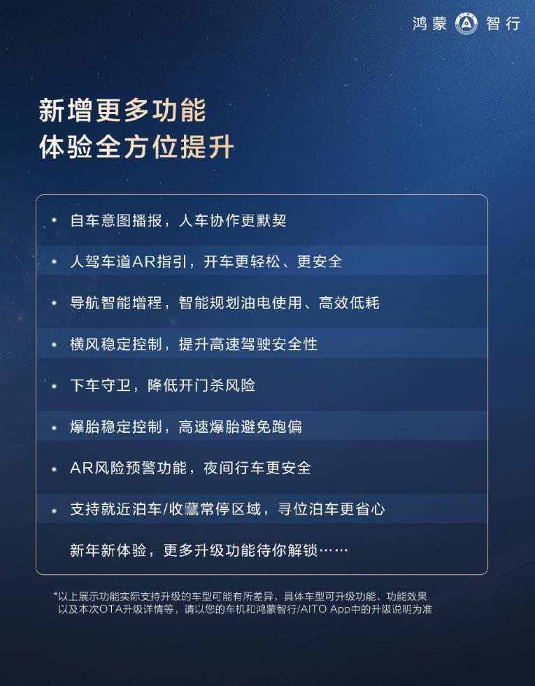 鸿蒙智行官宣,2026年首次OTA开启推送,63项新增功能,31项体验优化,涵盖体验、安全、趣味三大维度,一套图看懂更新了什么内容:智驾更老练,三点式掉头,泊车位置更精准,防夹心功能等,昨天有提前更新的用户试了,体验都说针不戳。明星语音包上车,组队模式+新春主题,车外喊话当COS“马路判官”,没有第一时间推的也不用着急,春节开4.1回家肯定来得及。【来自懂车帝车友圈】