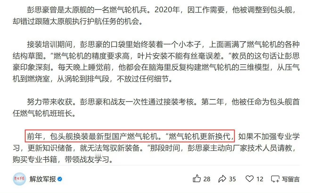 解放军报最新文章显示原来052D包头舰2024年就已换装新一代国产燃气轮机