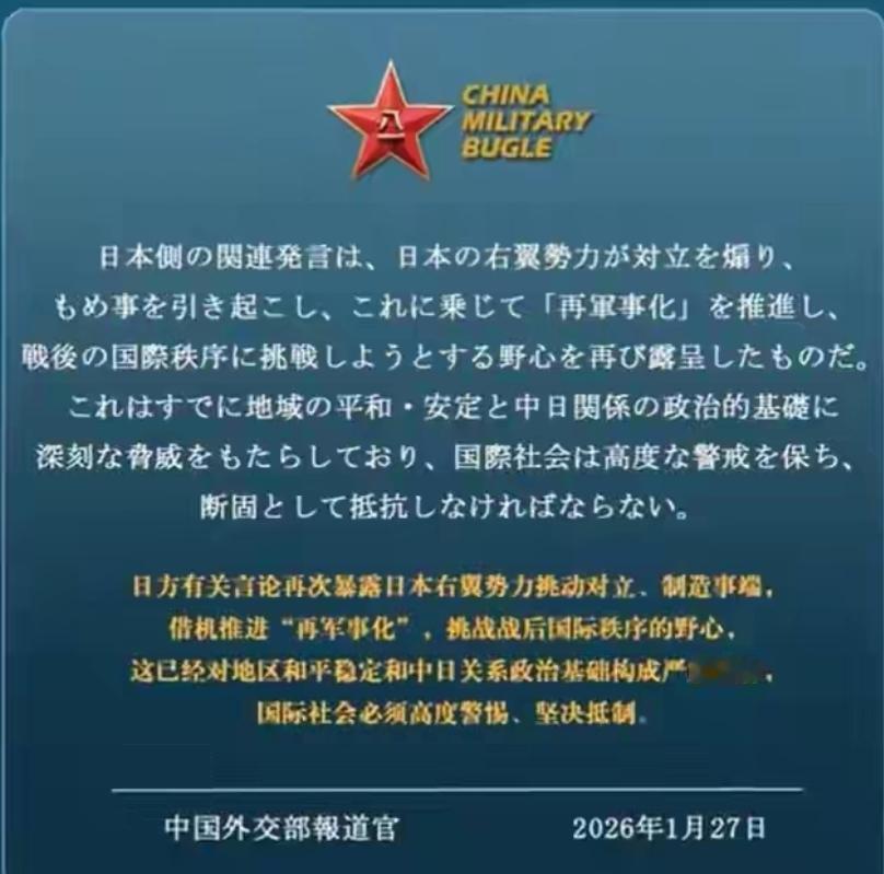 中国向世界发出要对日本动手的通告。1月27日,外交部发言人转载了中国军号发布的日语海报:“日方有关言论再次暴露日本右翼势力挑动对立、制造事端,借机推进‘再军事化’,挑战战后国际秩序的野心,这已经对地区和平稳定和中日关系政治基础构成严重威胁,国际社会必须高度警惕、坚决抵制。” 先说说中国军号是什么,这是解放军的官方权威平台,从这里发出来的每一句话,都是解放军的真实态度,没有一丝含糊。以往解放军的发声,要么说给国内民众听,要么面向国际军事层面,这次却特意做了日语海报,直接把话递到日本老百姓眼前,这步棋走得明明白白,就是冲着戳穿日本右翼的谎言去的。 这些年日本右翼一直在本土搞舆论忽悠,把自己的扩军行为包装成 “为了本土安全”,把挑动地区对立说成 “履行同盟义务”,把突破战后秩序的举动歪曲成 “适应局势”。他们拿着日本老百姓的钱,把防卫预算飙到 9.04 万亿日元,创了历史新高,却绝口不提这笔钱本可以用来改善民生、解决老百姓的实际问题。 反而把大笔钱花在造远程导弹、引进美国战斧导弹上,明着发展进攻性武器,却还骗本国民众说 “只是为了自卫”。中国军号的日语海报,就是要撕开右翼的遮羞布,把他们挑动对立、搞军事扩张、想破坏地区和平的真实样子,直接展现在日本老百姓面前, 让他们看清,右翼的一意孤行,只会把日本拖进危险的泥潭。这招比单纯的国际谴责管用太多,因为直接断了右翼搞事的民意根基,让和平的声音,能直接传到日本普通民众耳朵里。 而外交部发言人的主动转载,更是让这次发声的分量直接拉满。这不是随手点个转发,而是把解放军的硬核警告,瞬间变成了中国的正式外交立场,军和政一条心,步调完全一致。 以往的中日博弈里,大多是外交部先表明立场,解放军再用军演等实际行动回应,而这一次,直接在舆论层面实现了军政协同,军方先直接跟日本民众讲真相,外交立刻向全世界摆明态度,明明白白告诉所有人,在对日这件事上,中国没有任何模糊地带,更没有半分退让的空间。 中国之所以发这么重的警告,根本原因就是日本右翼近期的所作所为,实在太过分,一次次突破底线,挑战中国的核心利益,也破坏着战后的国际秩序。 日本右翼嘴上说着和平,手上的动作却一刻没停。他们提前两年把防卫费拉高到 GDP 的 2%,专门拿出 9733 亿日元打造远程打击能力,改进型的反舰导弹火速量产,引进美国战斧导弹的事也提上了日程,彻底把之前承诺的 “专守防卫” 抛到了脑后,明目张胆搞进攻性战力。 不仅如此,日本还把军事扩张的手伸到了太空,直接把航空自卫队改名叫航空宇宙自卫队,还专门组建了 880 人的太空作战部队,硬生生把和平的太空,变成了自己扩军的战场。在离中国很近的西南诸岛,他们不停囤兵、建军事基地,一步步打造针对中国的军事部署,把和平宪法的约束抛得一干二净。 政治上的挑衅更是变本加厉,日本的政客高市早苗,公然在全国转播的电视节目里叫嚣,说 “台湾有事,日美就要联合行动”,硬生生把台海问题和日美同盟绑在一起,还把台海局势说成是 “日本的存亡危机”,这就是赤裸裸干涉中国内政,把地区和平当儿戏。 在钓鱼岛问题上,日本的石垣市还跟着凑热闹,通过涉钓的相关条例,妄图把中国的钓鱼岛占为己有,冲绳的自卫队部队还直接升级,军事部署和政治挑衅双管齐下,每一步都在触碰中国的红线。 这次中国军政协同发声,也是明明白白告诉全世界:日本右翼搞军事扩张,从来都不是中日两国之间的小事,而是关乎整个东亚地区和平稳定的大事。 日本是二战的战败国,本来就该守着战后的国际秩序,好好反思历史,约束自己的军事行为,结果现在却一再突破底线,让军国主义的苗头又冒了出来,这不仅是背叛了历史,更是在挑衅所有爱好和平的国家。 中国这次的做法,既是直接震慑日本右翼,也是给整个东亚立规矩:战后的国际秩序不能破,地区的和平稳定不能毁,谁要是敢一条道走到黑,谁就要承担相应的后果。 中日两国隔海相望,离得这么近,本来就该好好相处,友好合作的根基一直都在,中国从来都不想和日本闹僵。但友好从来都不是单方面的,不是中国一味退让就可以的,日本必须尊重历史,承认自己的战争罪行,更必须尊重中国的核心利益,不干涉中国的内政,不打台海、钓鱼岛的歪主意。 这次 1 月 27 日的发声,就是中国给日本右翼敲的最响的警钟。