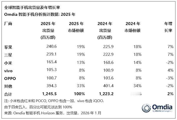 Omdia数据显示:2025全球智能手机出货量增2%达12.5亿部,创2021来新高。苹果iPhone出货2.406亿部同比增7%,三连冠,Q4出货破纪录,大陆市场同比增26%,受iPhone17需求推动;三星反弹增7%居次;小米稳前三但Q4出货降2%;vivo首进第四1.053亿部,OPPO第五1.007亿部,2026合并realme后有望冲高。荣耀、联想分别增11%/6%创新高,华为五年首夺大陆市场第一,Nothing暴增86%破300万部。
