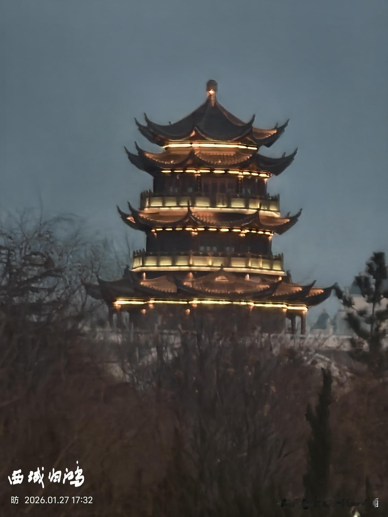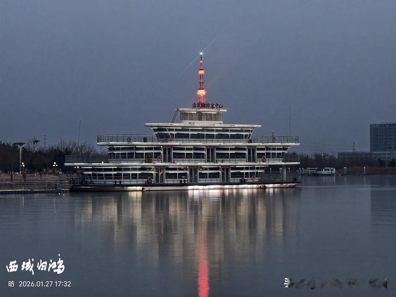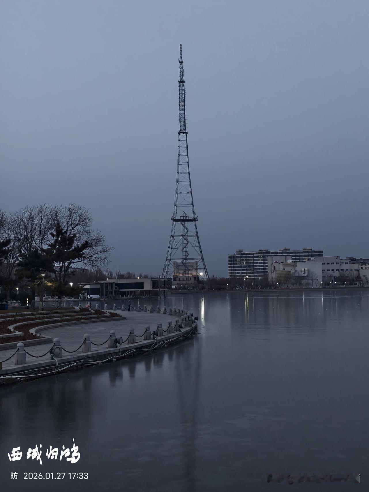 看图识东营:黄昏中的东营电视塔,清风湖游客服中心、清风阁。