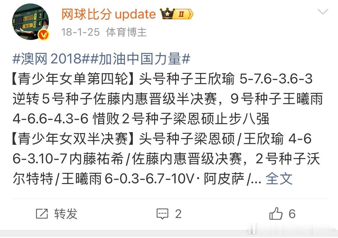 这很澳网 澳网青少年女单四强记录2008澳网青少年四强:🇨🇳周奕妙2010澳网青少年四强:🇨🇳唐好辰2014澳网青少年四强:🇨🇳孙子玥2018澳网青少年四强:🇨🇳王欣瑜2020澳网青少年四强:🇨🇳白卓璇