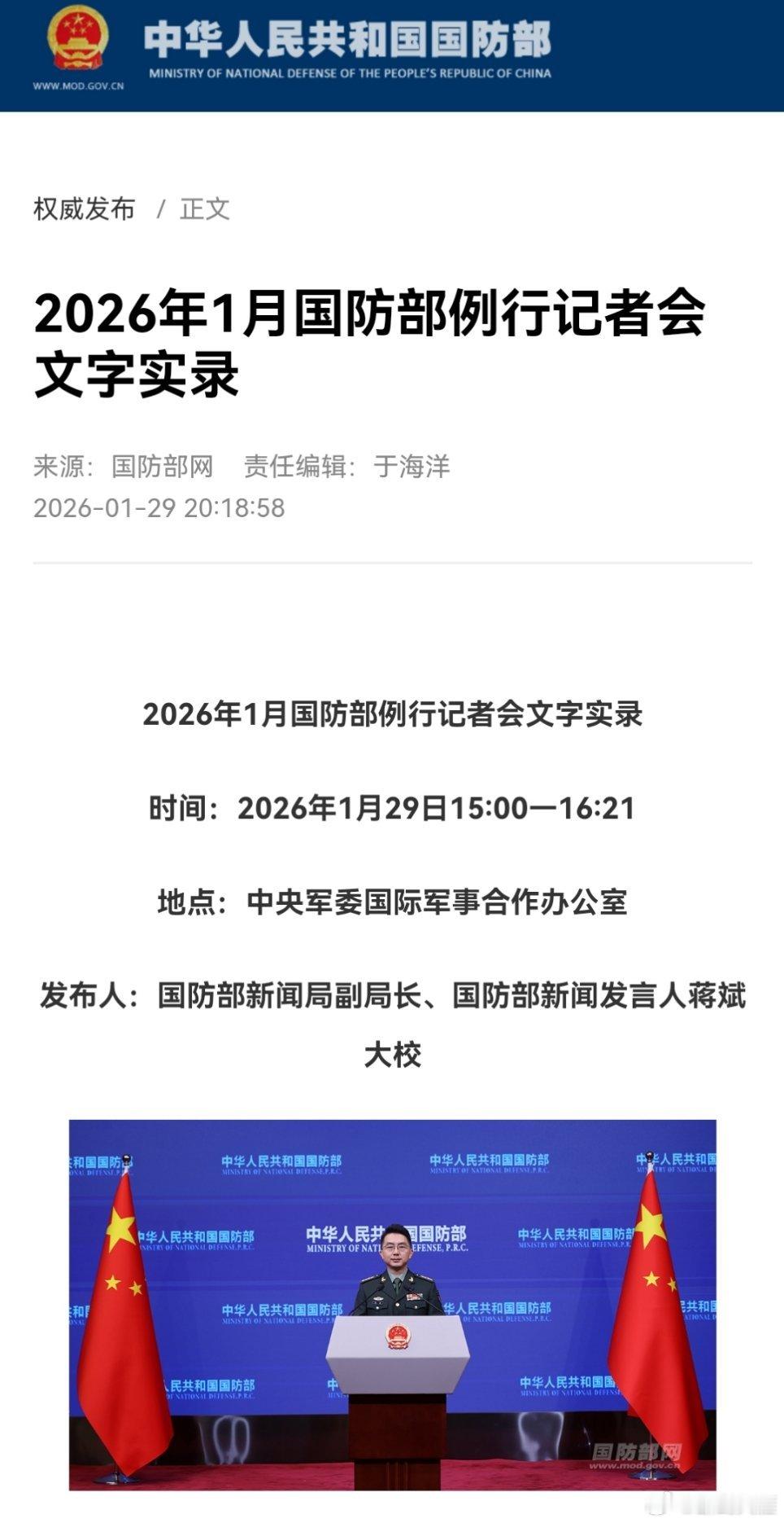 【国防部:#任何遏制围堵中国企图都不可能得逞#】国防部1月29日下午举行例行记者