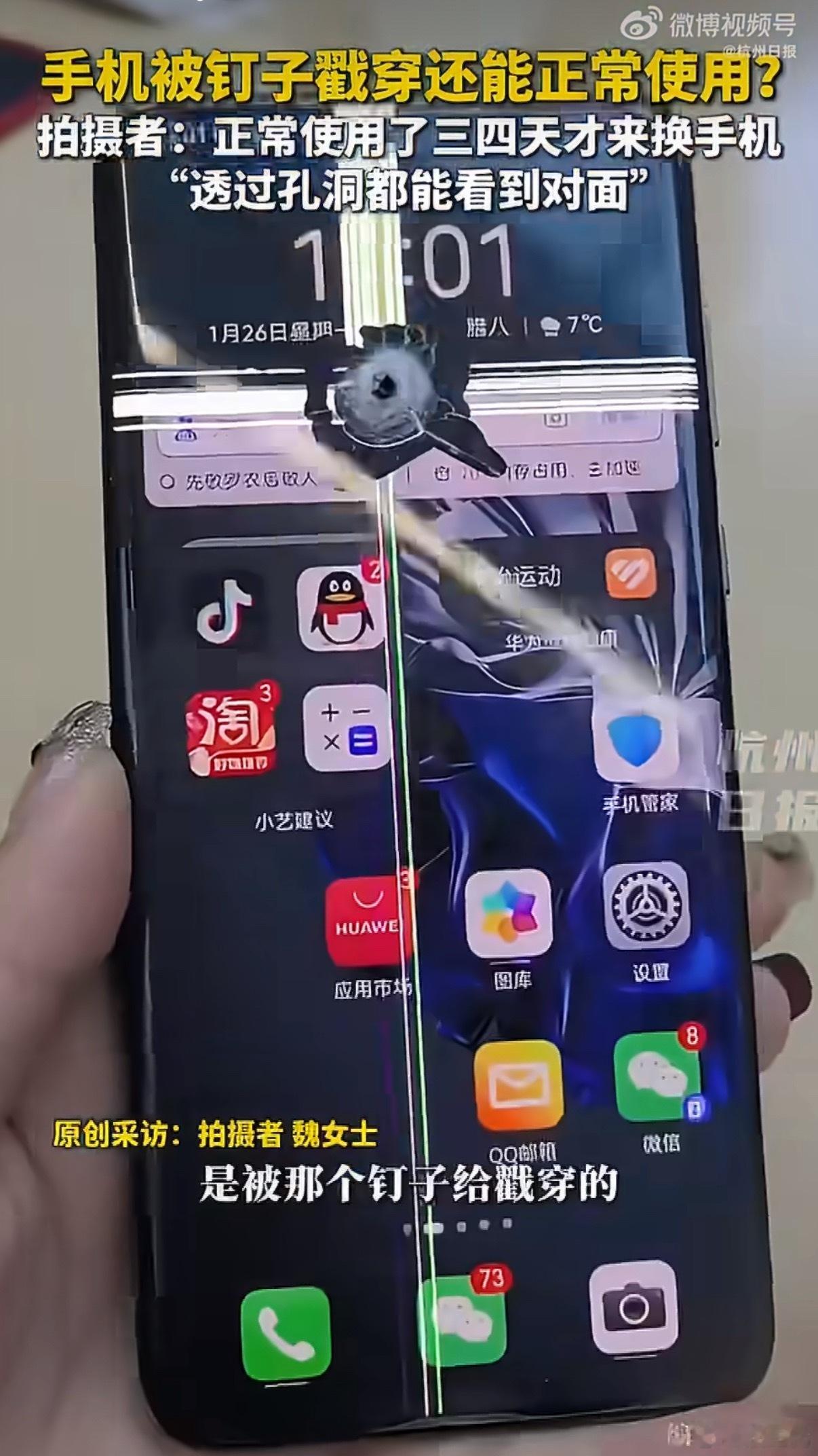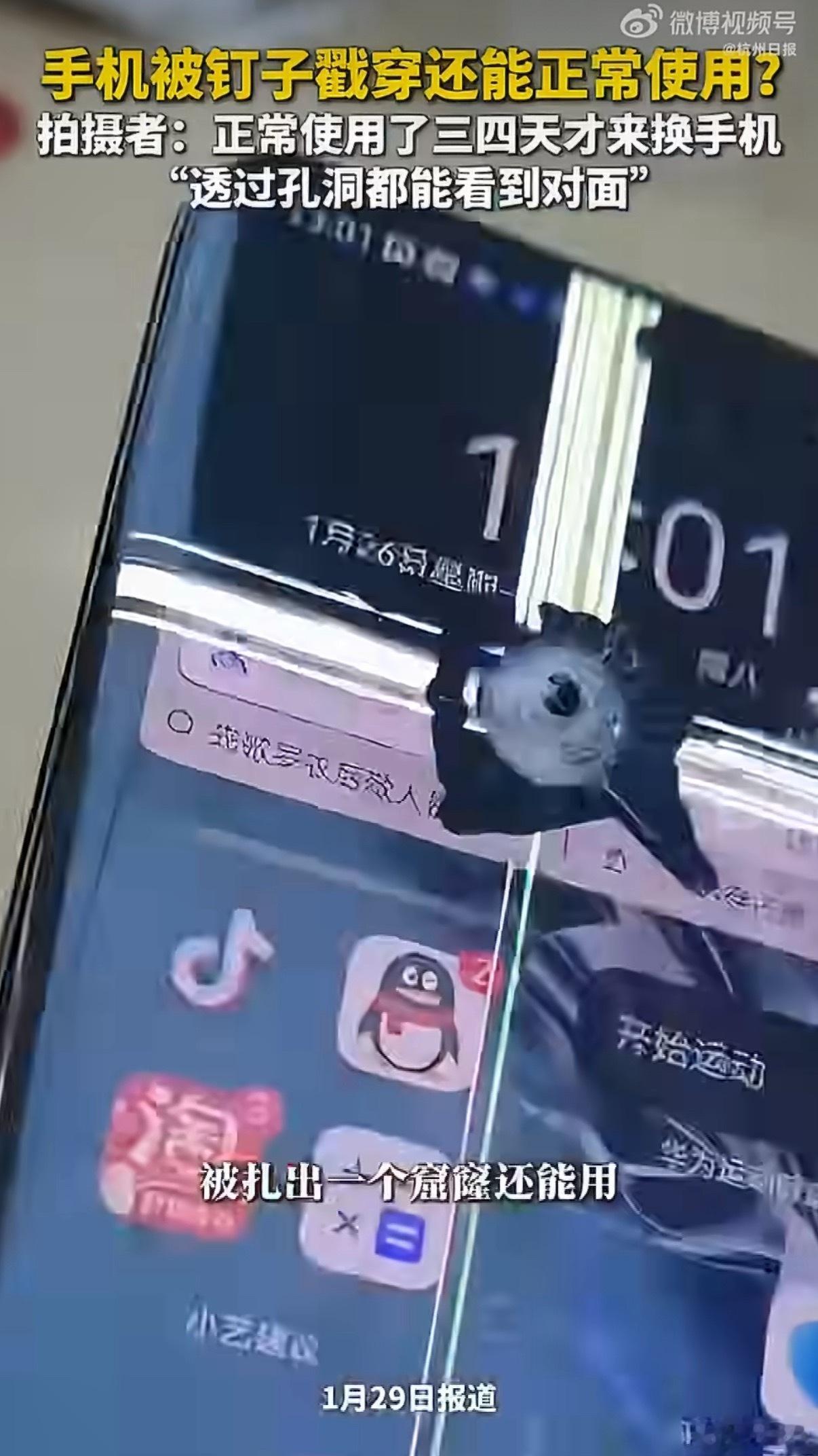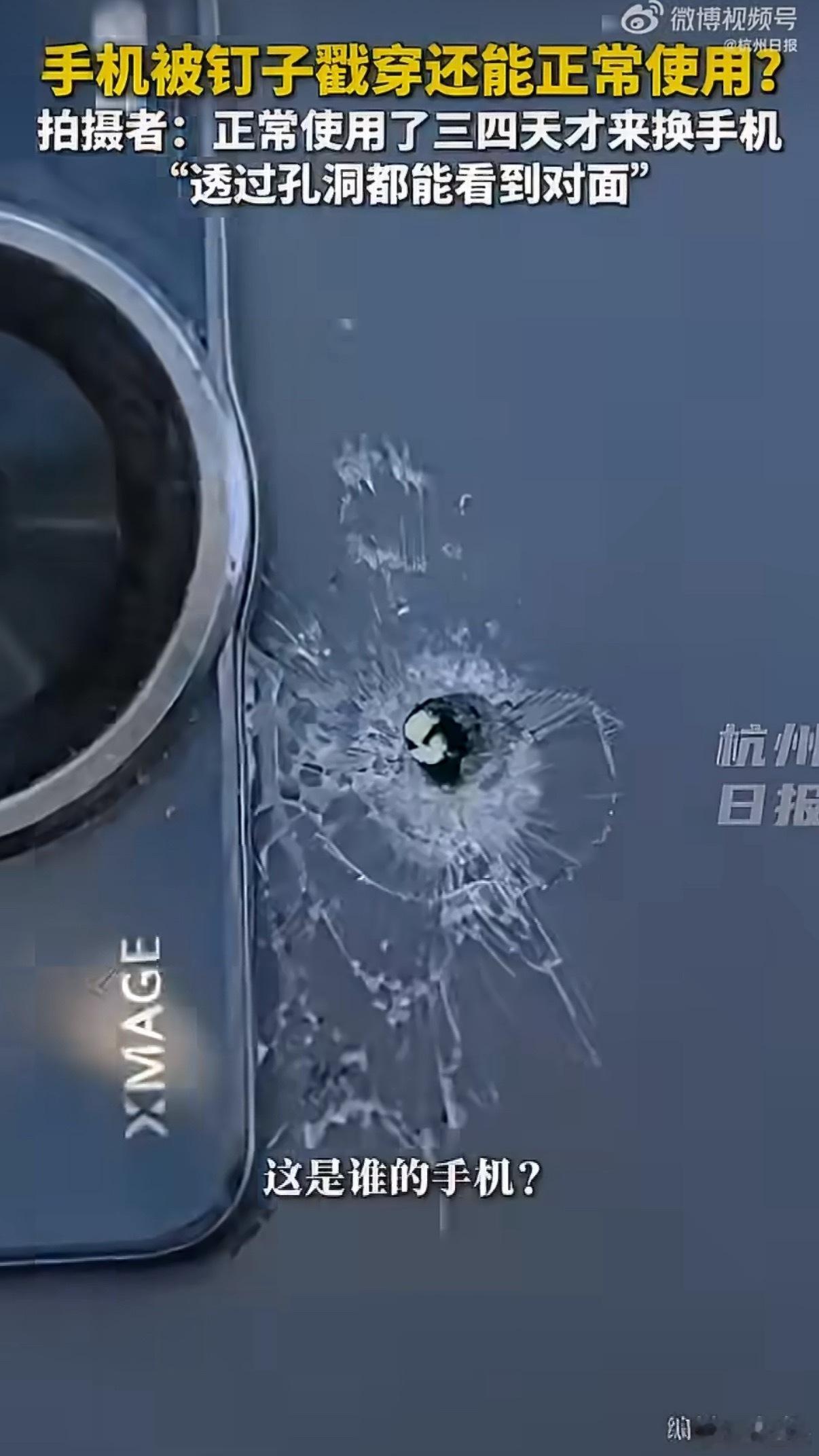 网友手机被钉穿还能正常使用又有新花样了,华为的手机被钉子扎穿了还能正常用,质量确实好。经常能看到手机被火烧之类的新闻,能不能对自己的手机好点?
