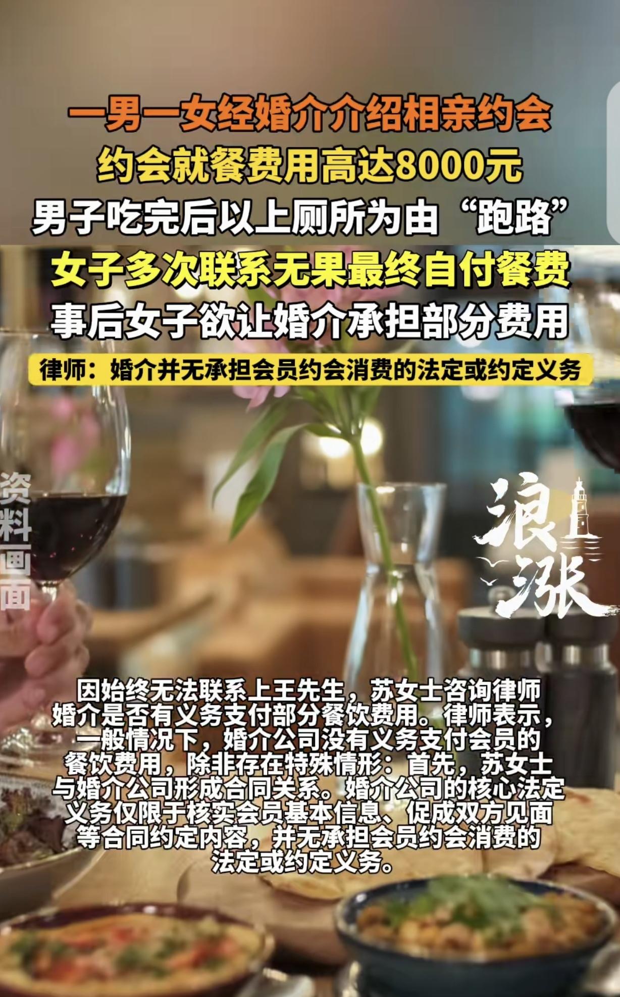 “干得漂亮!”一女子和相亲男在餐厅见面,点了8000多元的菜,男子吃饱喝足,借口
