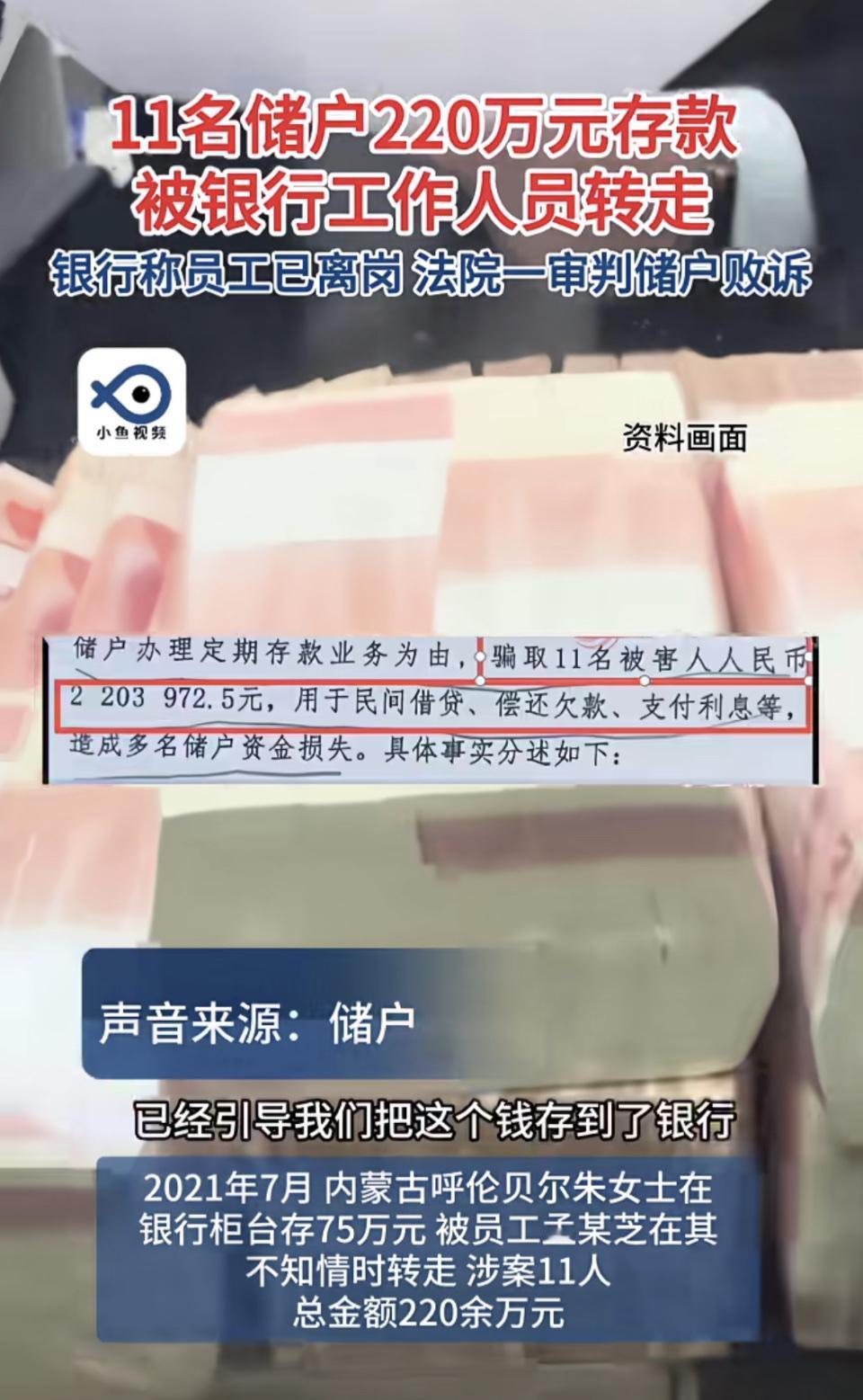 银行员工转走11名储户220万元存款,法院一审判储户败诉。储户把钱存银行,本就是图个安全,结果钱被银行员工转走,自己还败诉,这换谁能接受啊。 银行对员工监管不力,才导致这种事发生,责任肯定有银行的一部分。就好比你把东西放仓库,仓库管理员给你弄没了,最后还怪你没看好。希望后续能有公正的处理结果,不能让储户寒了心,不然以后谁还敢把钱存银行啊。 储户取钱死亡 储户取钱 储户取钱死亡 储户取钱 储户存单 老人取款事件 储户权益隐忧 储户 储户资金蒸发