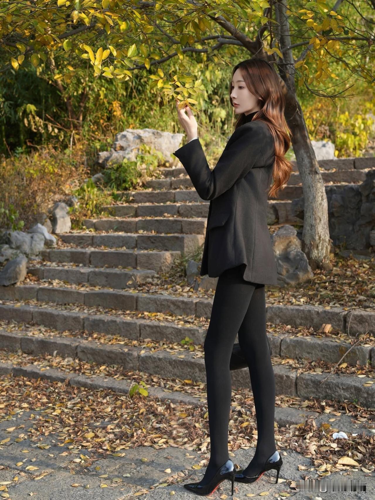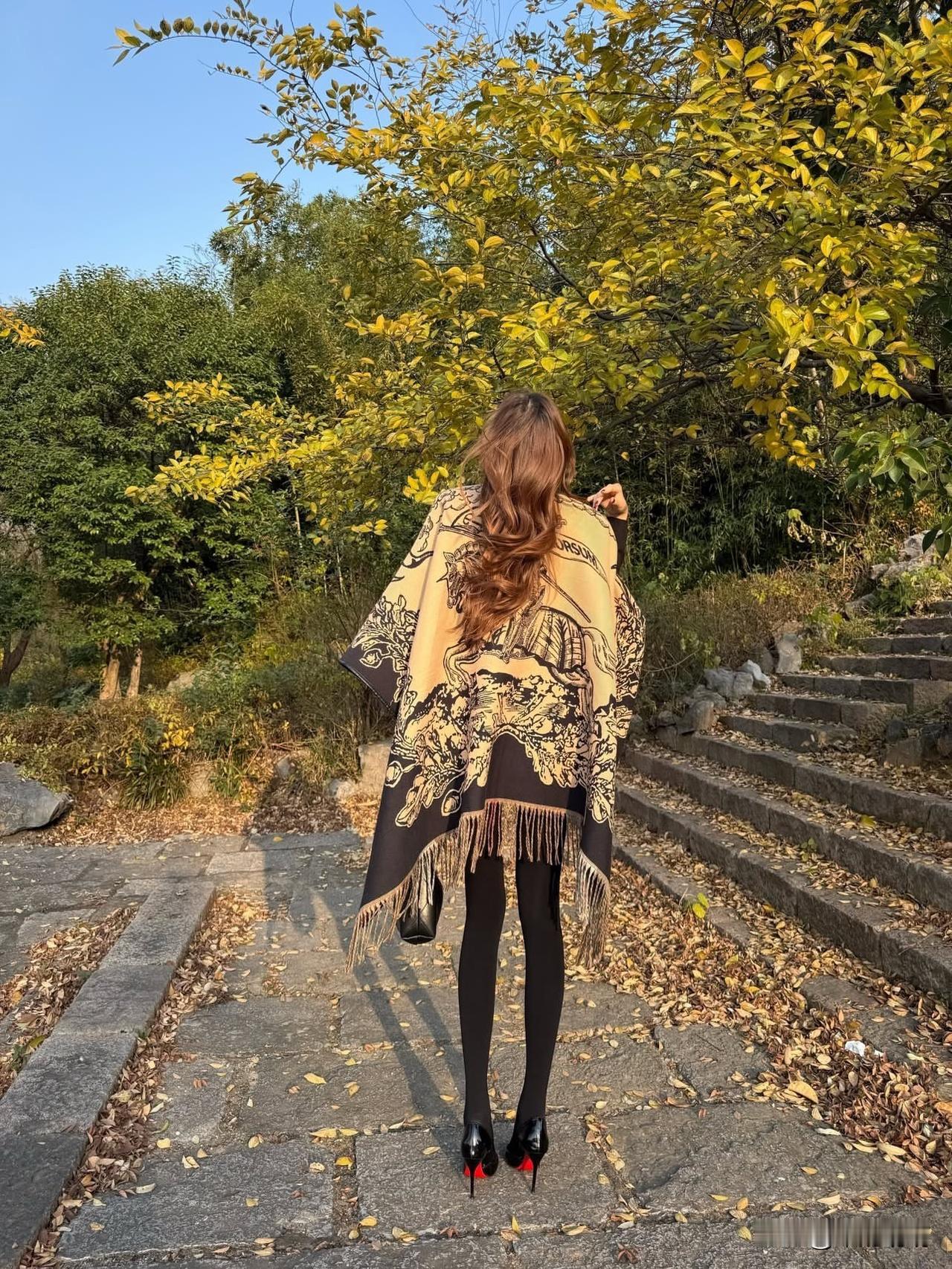 秋日漫步,披风飘逸,红唇高跟鞋,尽显优雅与神秘。