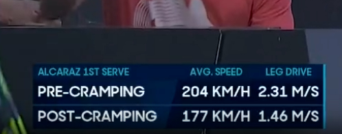 我听的英文版解说,两位解说员一直用的抽筋的语境,还说到阿卡喝酸黄瓜汁的镜头。屏幕给出的数据,也是表明阿卡抽筋前后,他的一发时速与leg drive的巨大差异——腿部驱动力,也就是我们平常说的“蹬地”吧。