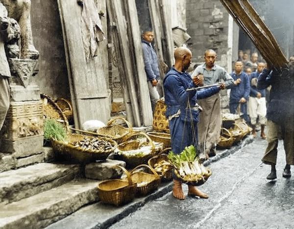 这是一张老照片,由美国社会学家甘博在1917-1919年间拍摄,精准定格了民初湖北宜昌老城街巷里最鲜活的谋生瞬间。 逼仄的石板路被雨水浸得发亮,泛着冷调的水光,仿佛能闻到雨后潮湿的泥土与老木头混合的气息。两侧是斑驳的木板墙与磨得发亮的石阶,墙面上挂着半干的旧布,左侧门楣处的石雕构件刻着模糊的花纹,默默诉说着老城的沧桑。 菜贩是个光头汉子,穿着打满补丁的粗布短衫,赤着脚站在湿滑的石板上,黝黑的皮肤泛着劳作后的油光。他身体微侧,一手稳稳攥着杆秤,另一手调整着秤砣,眼神专注地盯着秤杆,仿佛在认真称量着关乎生计的每一两蔬菜 路人穿着同样粗朴的衣裳,有的驻足望向菜摊,有的行色匆匆;右侧一个挑着长杆的行人正侧身走过,让整条街巷都流动着底层百姓谋生的烟火气,没有喧嚣,只有日复一日的踏实。