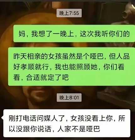 昨天去相亲。 一个妹纸看来很不错,要相貌有相貌,要身材有身材。 她只是默默陪我行了一程,一直听我喋喋不休的说,全程她都没有说一句话。 看来她是个聋哑人。 我心里一沉。只恨老天不公,给了她一扇窗,却关起了一扇门。 回到家,我煎熬了一个晚上,最后还是给我妈打了个电话说,她人不错,看起来很孝顺,我能照顾她。你们看看,合适就定了吧。 没想到妈说,她问过媒人了,是人家没看上我,所以不跟你说话。人家不是哑巴。