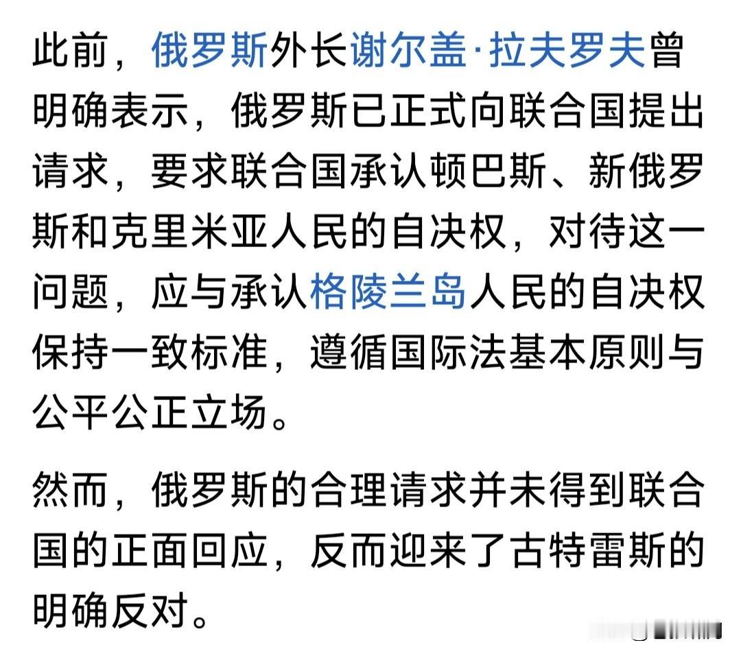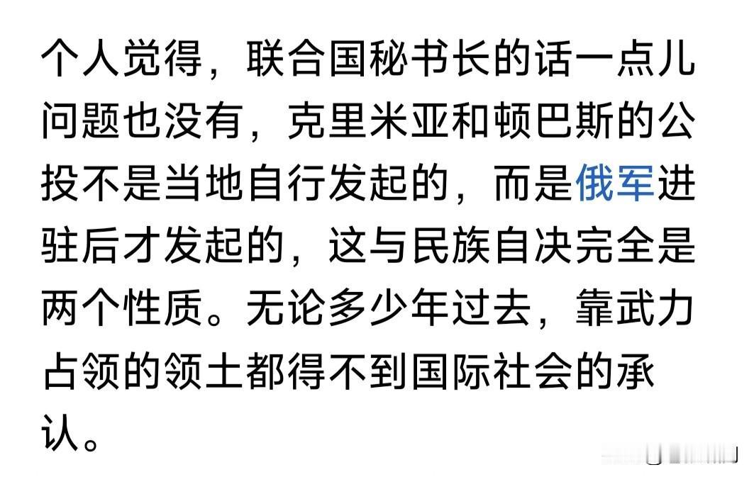 古特雷斯这回硬了!直接回绝俄控克里米亚地区领导人,要求联合国承认“顿巴斯和克里米亚自决权”。 老古表示反对说:自决权不适用顿巴斯与克里米亚!涉及乌克兰问题,应首先适用“领土完整主权”原则! 什么叫“顿巴斯与克里米亚”自决权?应该指的是俄先后占领这两个地方之后,举行的“全民投票”公决吧? 什么叫“领土完整主权”?就是联合国宪章与国际法规定:尊重各国领土完整与主权!这是联合国的根基。 当然“公投自决”也是“联合国宪章规定”的,但有“大原则”与“小原则”之分,“小原则”要符合“大原则”框架! 进一步说明:某个地区“自觉公投”,必须首先尊重当事国“领土完整与主权”!说白了就是“反侵略反分裂”吧! 苍狼觉得古特雷斯,这次态度坚定,主要原因还是其身份:作为联合国秘书长,他必须维护“联合国宪章”。 再就是对于俄乌战争,联合国几个最大“会费承担方”中美欧,都一致表示遵守联合国宪章与国际法,尊重各国领土完整与主权!联合国大会并多次高票通过决议,要求发动战争一方撤军! 作为联合国秘书长,古特雷斯要支持大多数国家立场!尤其是中美欧“三大会费承担方”,他更得支持了!如果都像老美拖欠会费,联合国关门吧! 苍狼这次支持古特雷斯,俄乌问题应首先适用“领土完整主权”原则!如果像克里米亚领导人说的,少数民族地区都能“自决公投”,世界岂不乱套了? …………