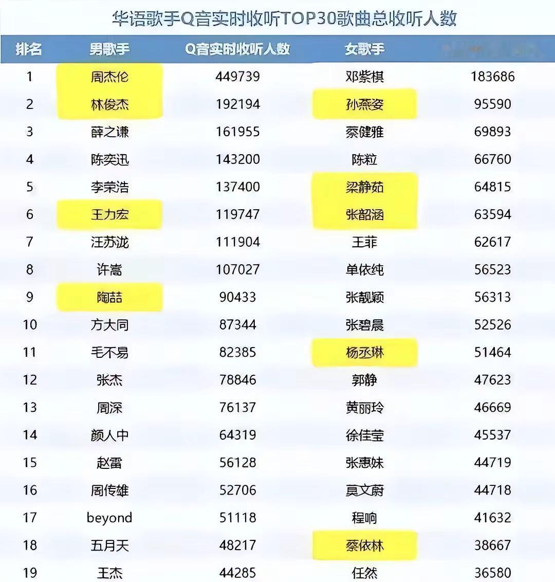 华语歌手QQ音乐实时收听人数top10:你最喜欢哪一位?