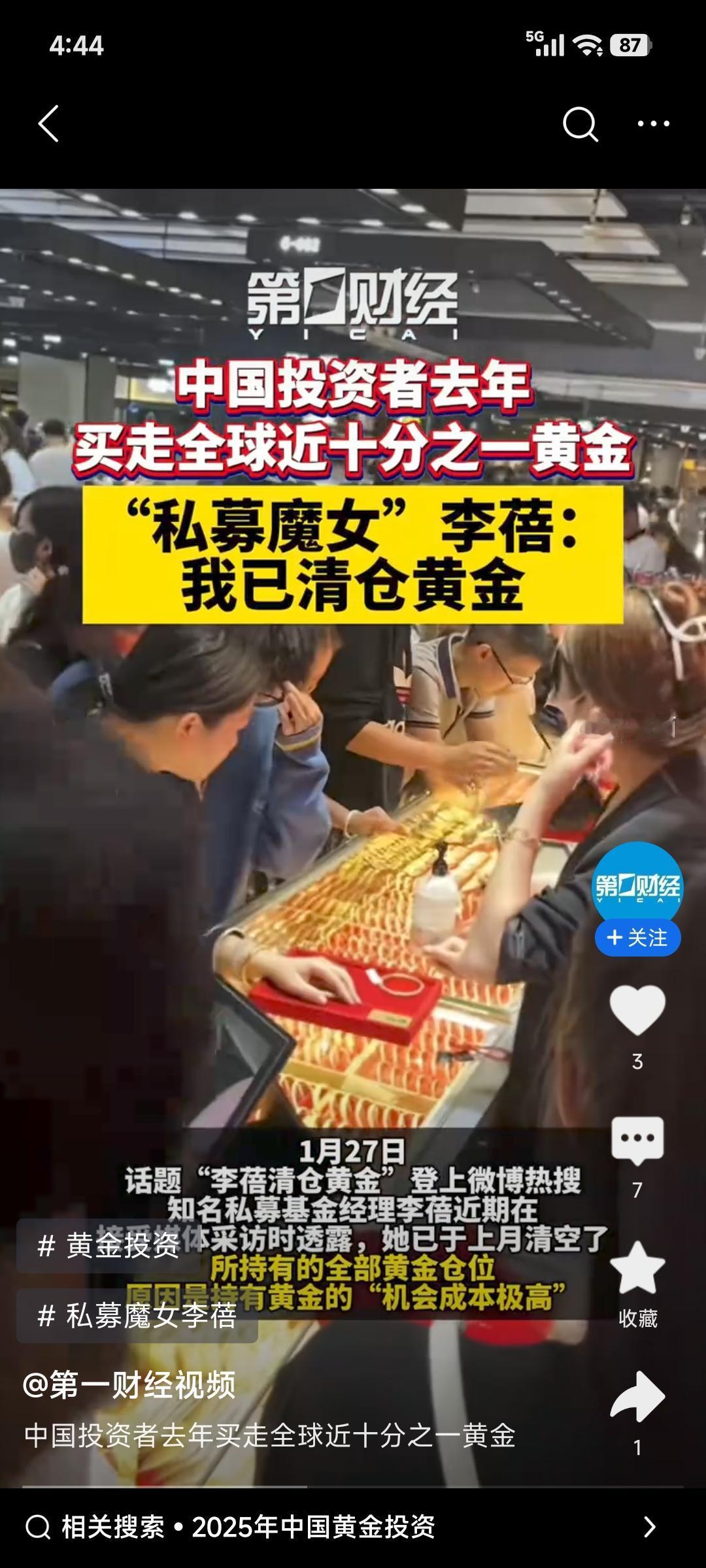 中国人购买力真牛,去年直接买走全球近10%黄金!2025年全球黄金总需求达5002吨,中国投资者就购入432吨金条金币,较上一年增长28%。 近期金价也很疯狂,1月29日现货黄金首次突破5500美元/盎司。可投资者心态分化严重,有人纠结追不追高,像李先生4000美元时就嫌高,现在涨这么多还在犹豫。知名基金经理李蓓则清仓黄金,觉得持有它机会成本高,还可能因人民币升值贬值。美东时间29日,黄金白银还盘中跳水,追涨风险不小,大家投资可得谨慎。