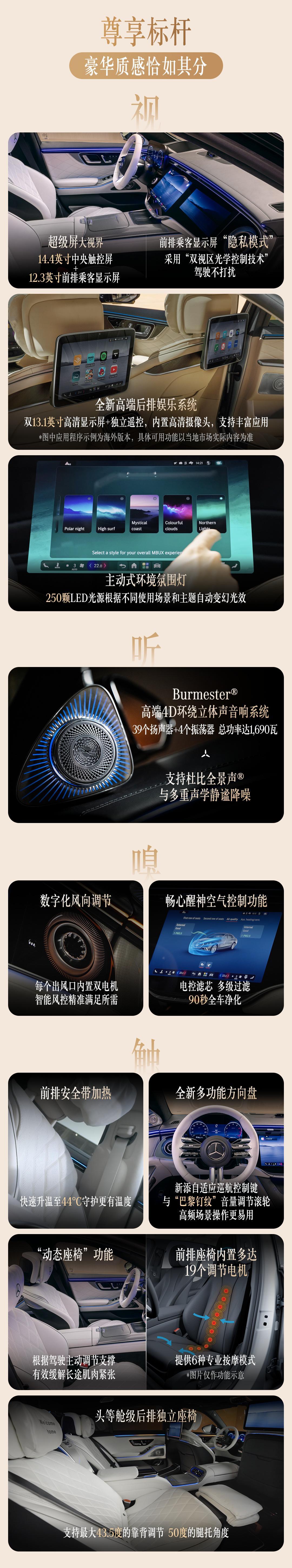 内饰豪华型上不用多说,奔驰S级的豪华肯定是非常顶的,动态座椅功能,可以根据驾驶主动调节支撑,前排座椅还有安全带加热。方向盘还新添了自适应续航控制键。性能方面,采用了进阶高性能V8+48伏特轻混系统。还支持智能底盘路面记忆功能,智能化和安全性上都有升级。
