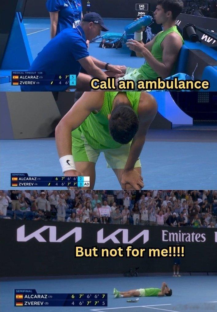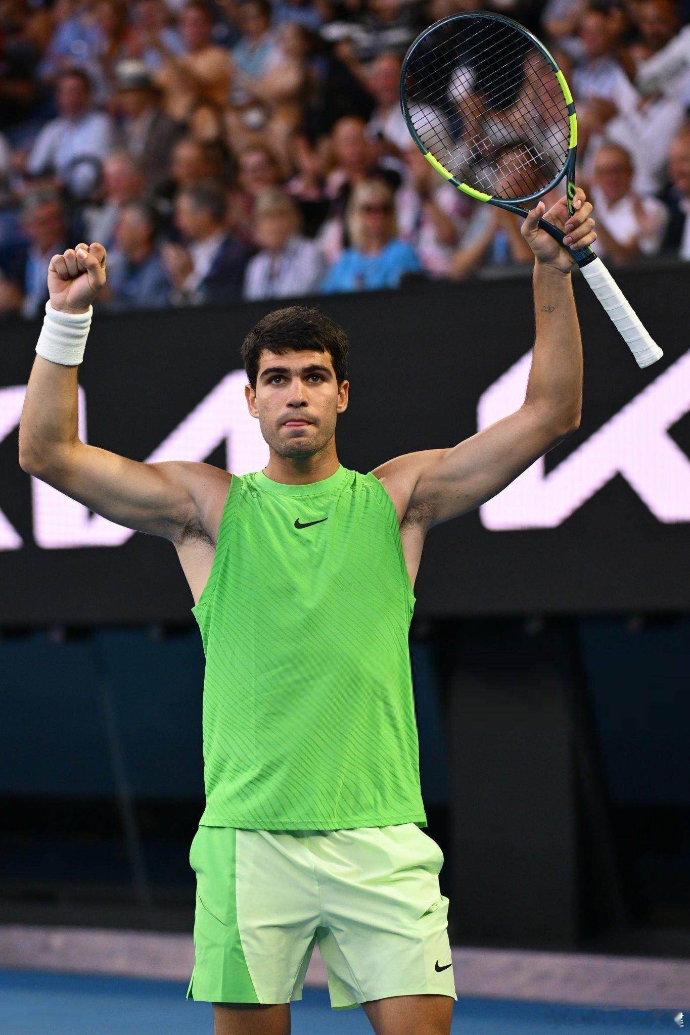 能首夺澳网吗?阿尔卡拉斯顶住抽筋影响,决胜盘3-5后连下4局,6-4/7-6/6-7/6-7/7-5险胜兹维列夫,首进澳网决赛!四大满贯都进过决赛、总第8个大满贯决赛(6胜1负)!阿尔卡拉斯首进澳网男单决赛阿尔卡拉斯连续四个大满贯进决赛这很澳网
