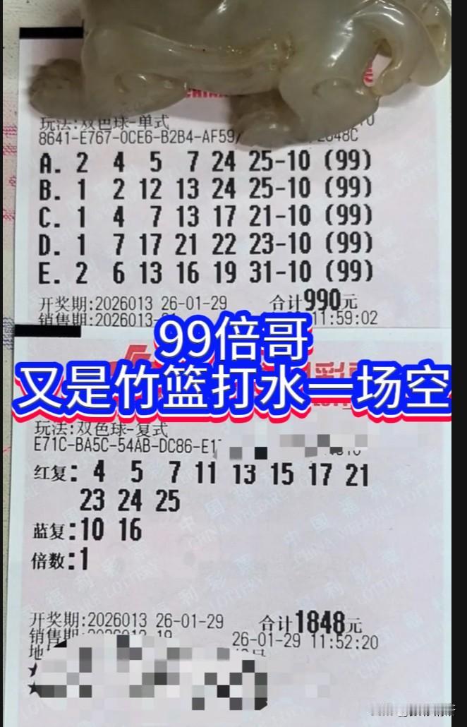 双色球第26013期开奖结果:红球号码为04、09、12、13、16、20,蓝球号码为01。备受关注的网络红人辛丹丹与“99倍哥”之间的投注比拼亦已见分晓。此番较量中,“99倍哥”所购五注单式彩票有四注均为2+0;其复式“11+2”投注同样止步于2+0。另一边,辛丹丹的“16+4”复式票也仅收获2+0战绩,而精选单注更是未中任何号码。 至此,二人此番角逐结局殊途同归——均未获得奖金。尤其令人惋惜的是,“99倍哥”此番投入的2838元购彩资金,再度随流水东去,空留余叹。