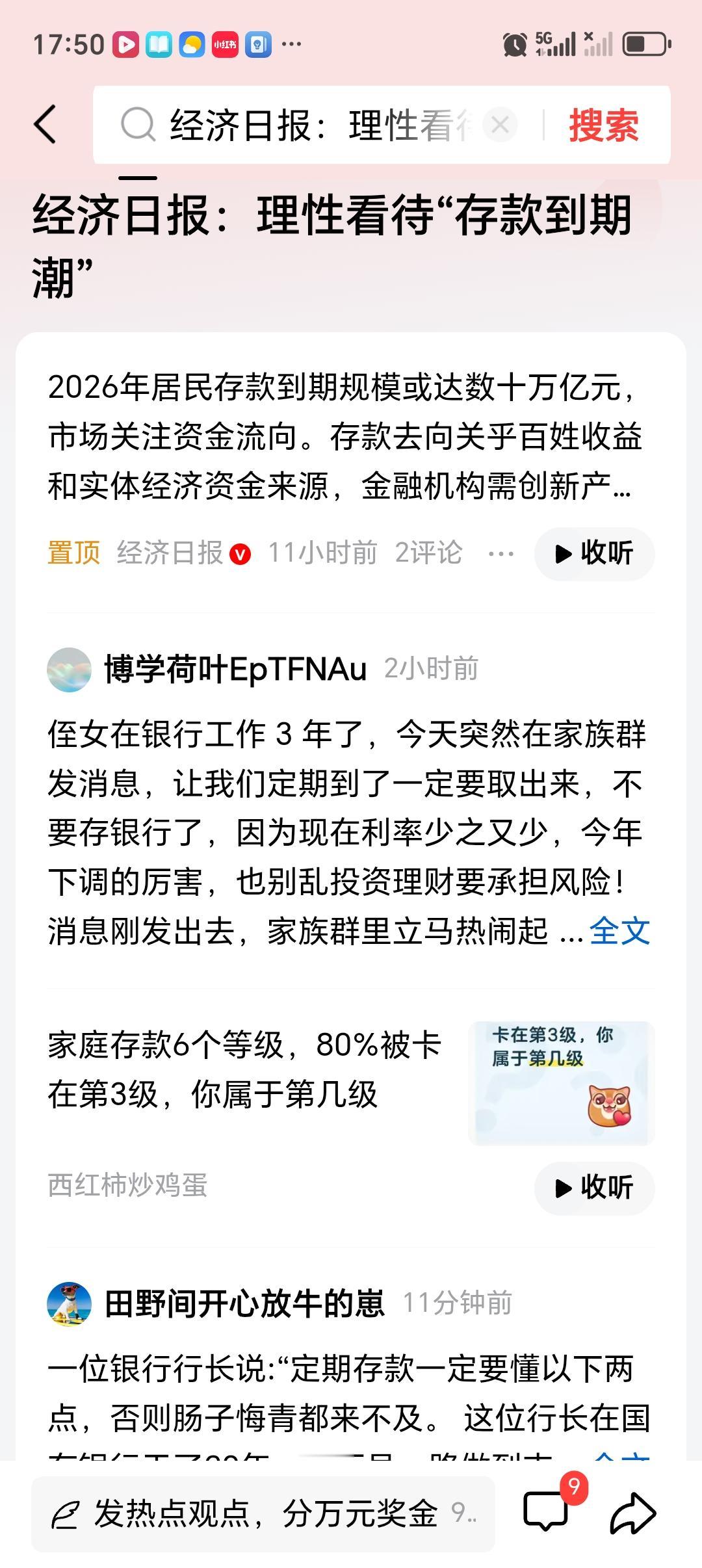 经济日报:理性看待“存款到期潮” 最近“存款到期潮”闹得沸沸扬扬,《经济日报》都说要理性看待了。其实这事儿也不难理解,前几年大家为了求稳,不少人都把钱存了定期。现在到期了,就面临新的选择。有人觉得存款利率降了,到期后就想拿出来找别的投资渠道;也有人依旧求稳,继续存着。但不管怎么选,都得结合自身情况。要是盲目跟风,看到别人投资啥就跟着去,很可能踩坑。还是得冷静分析,理性对待“存款到期潮”,稳稳守护好自己的钱包。
