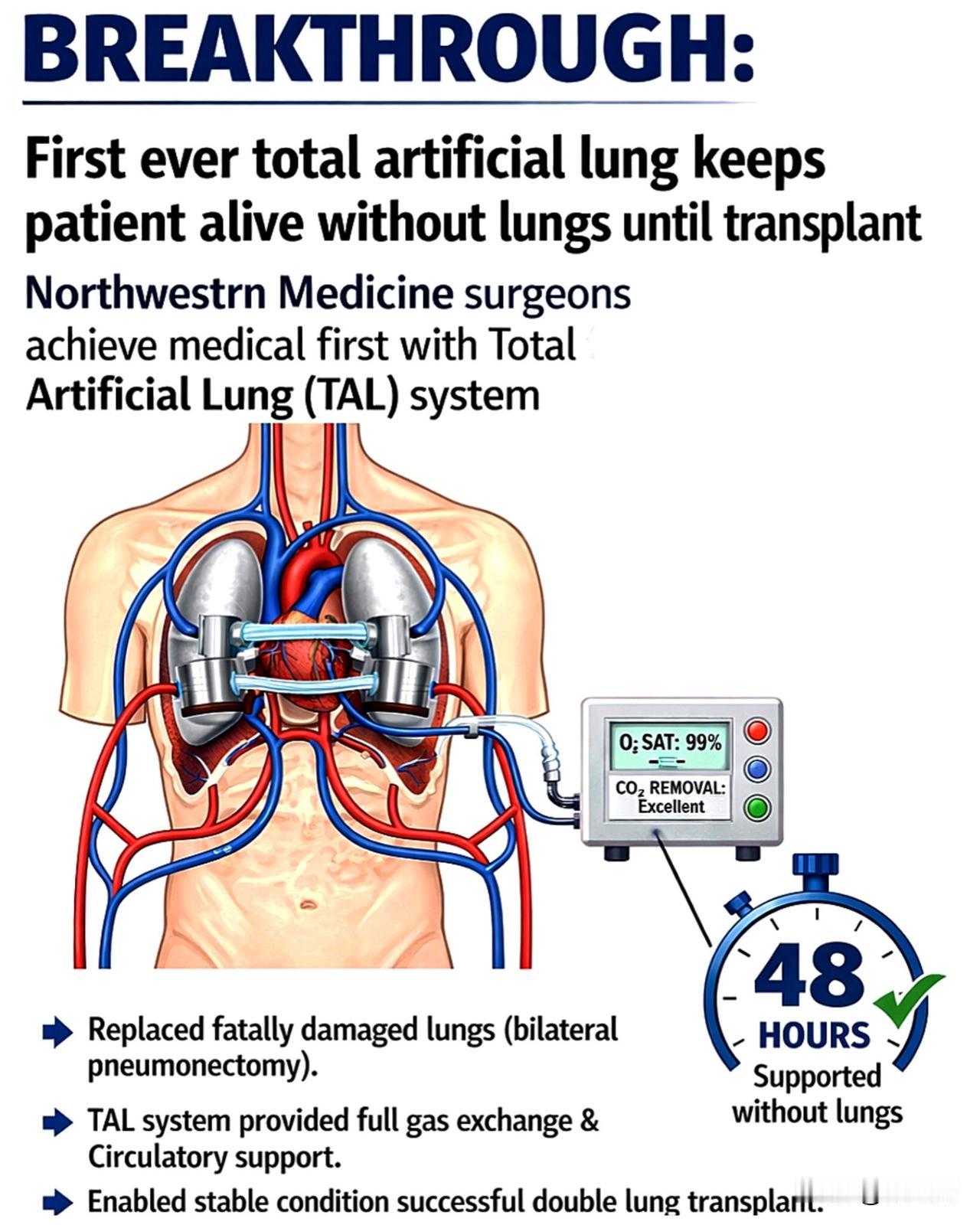 突破性进展:首个全人工肺让肺移植前的病人得以存活。 美国西北大学医学院的外科医生首次利用全人工肺(TAL)系统成功挽救​​了一位无肺患者的生命。这位33岁的男子因流感引发的肺炎导致肺部严重受损,入院时病情危重,抗生素和常规治疗均告失败。医生为他进行了双肺切除术,并利用人工肺系统完成了气体交换和循环支持,这是体外膜肺氧合(ECMO)等传统呼吸机无法独立完成的任务。 在48小时内,TAL系统为他的血液供氧、清除二氧化碳并维持稳定的循环,使他的身体状况稳定下来,足以接受双肺移植。对切除的肺脏进行先进的实验室分析显示,肺脏已遭受不可逆的损伤,不进行完全置换就无法恢复。两年后,患者肺功能良好,健康状况良好,这标志着生命支持技术取得了巨大的进步。 这项突破表明,我们正逐步接近能够暂时替代整个器官(而不仅仅是辅助衰竭器官)的机器。随着人工器官系统的不断发展,致命疾病与生存之间的差距正在缩小,这提醒我们,医学的未来或许比我们预想的更加机械化。 这项研究成果由美国西北大学西北医学中心坎宁胸外科研究所的安基特·巴拉特博士团队完成,相关细节于2026年1月发表在《细胞》(Cell)旗下的医学期刊《Med》上。