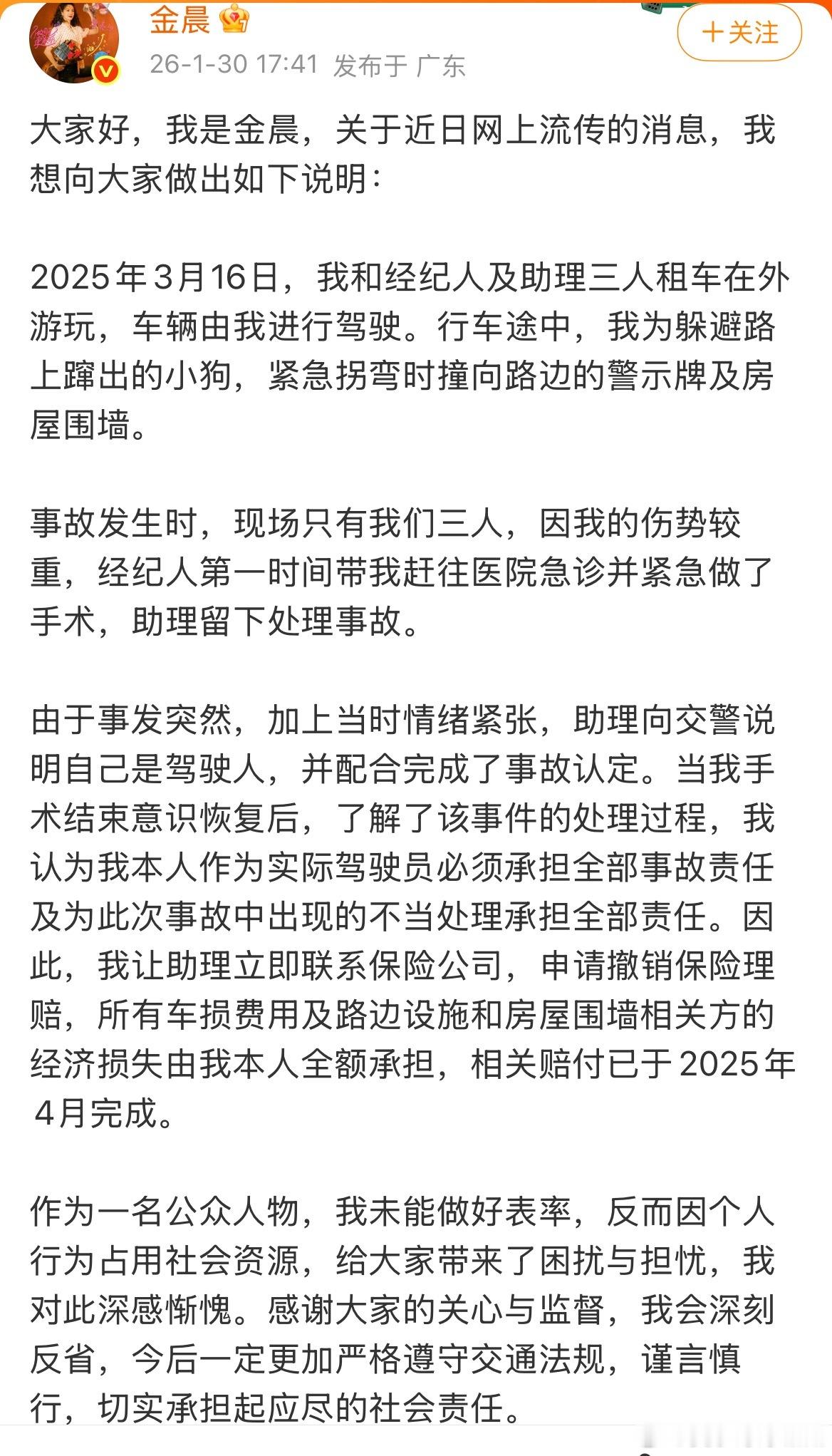 警方通报金晨事件金晨道歉 我就说这事没那么简单,金晨一没酒驾,二没无证驾驶,为什么会肇事逃逸?感觉像是狗仔有预谋的一场炒作,都快过去一年了,现在翻出来肯定是有什么目的!看金晨当时受伤的照片就知道挺严重的,肯定要先去医院治疗,至于助理为什么撒谎说她开的车,可能也是护主心切,但后来金晨也撤销了保险理赔,也就不存在什么骗保,一个一线女星还不至于骗保险公司那点钱。再说回来事故原因是为了躲避路上突然蹿出来的小狗,开车的应该都深有体会,如果撞上去可能人没事,但是小狗估计就死了,我只能说金晨还是太善良了金晨被曝肇事逃逸被撞墙农户已获赔