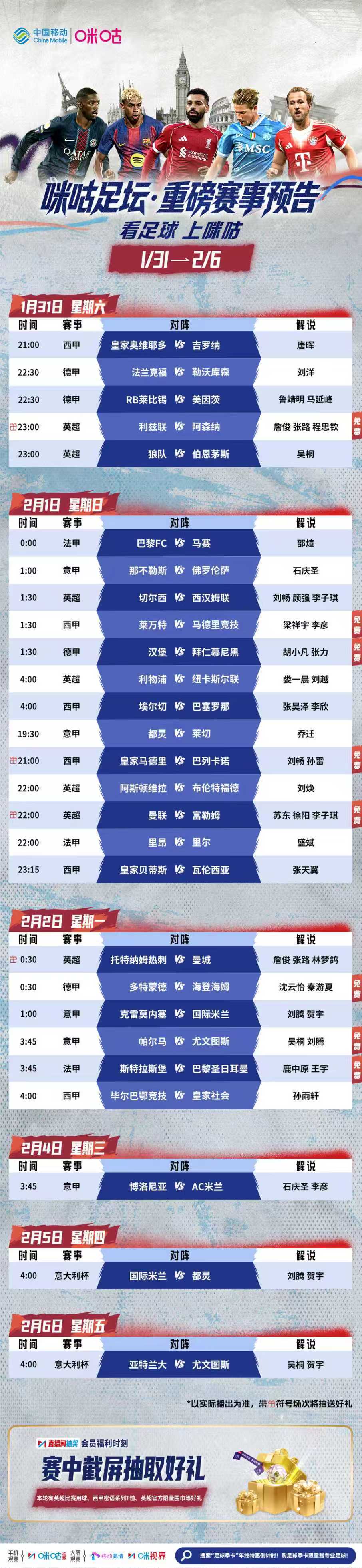 ⚽️ 重磅赛事预告𝟭.𝟯𝟭-𝟮.𝟲⚔️ 曼城客战热刺能否复仇🔥 巴萨本轮过后能否继续领跑🏟 联赛首败的拜仁客战汉堡👀 #看足球上咪咕#