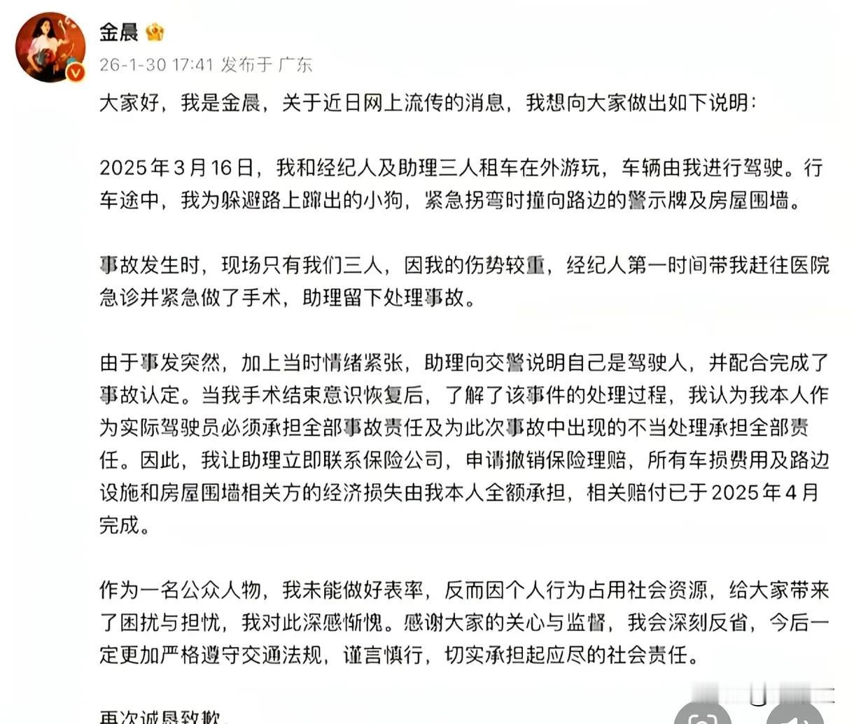 金晨这次公关绝对是100分! 在事件发酵后,她没有急于回应,这个时候不回应,比乱回应好! 警方公布真相后,金晨紧随其后回应,并且回应的更详细! 从回应来看,金晨不仅不能被批评,还应该被表扬。一是有爱心,为避让小动物出车祸,二是有担当,得知助理顶包后,第一时间撤销赔偿! 谁不为金晨点赞呢!