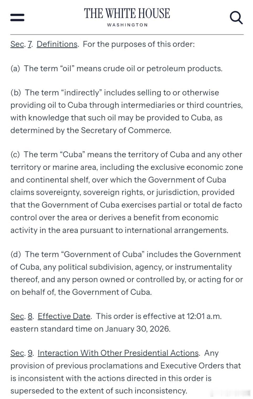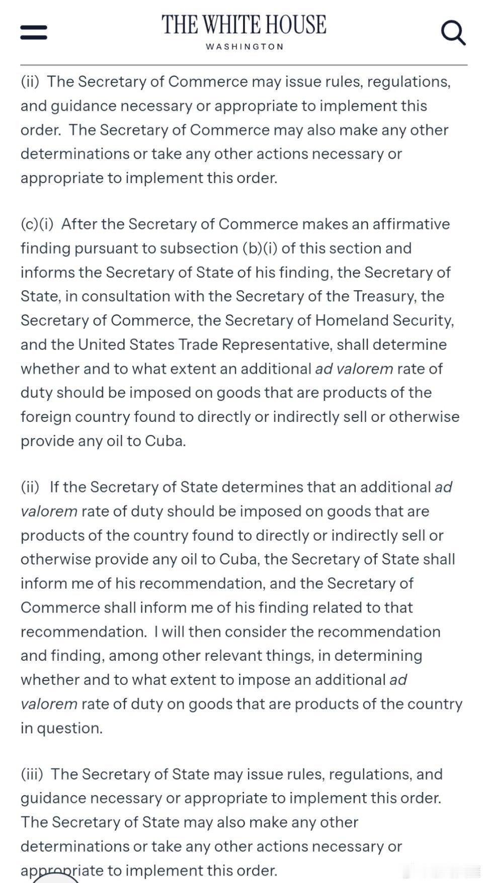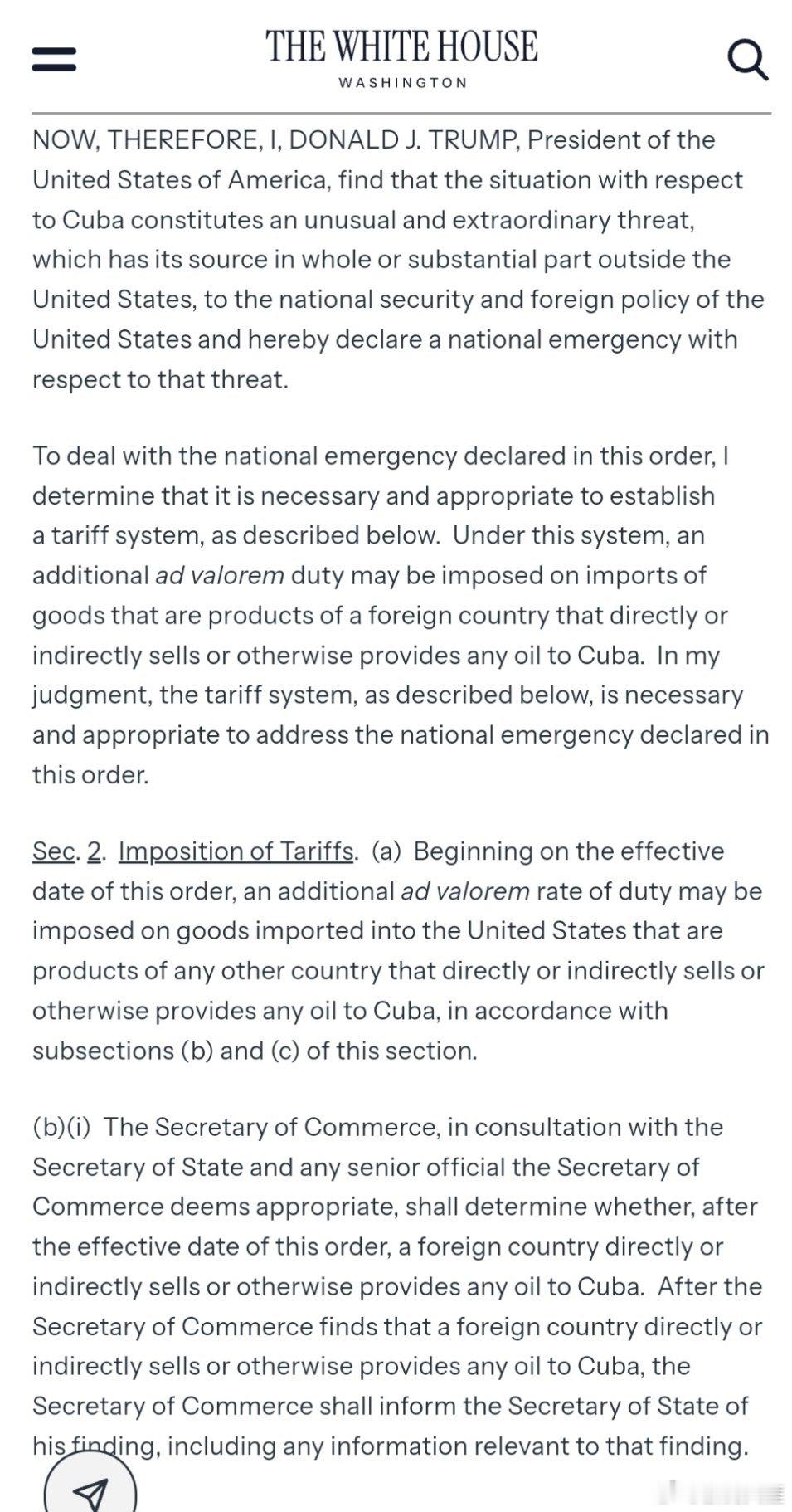 特朗普29日签署行政令,宣布国家紧急状态,威胁对向古巴提供石油的国家输美商品加征从价关税。(内容较多)(美官网)