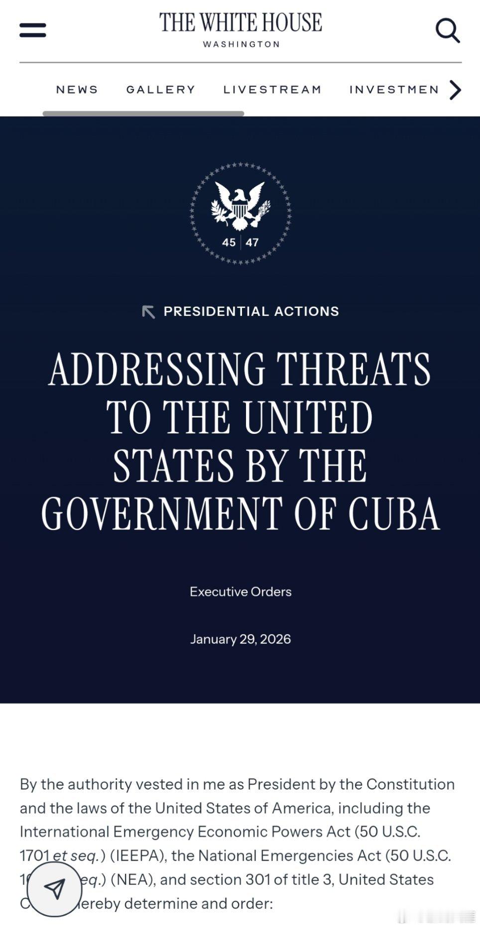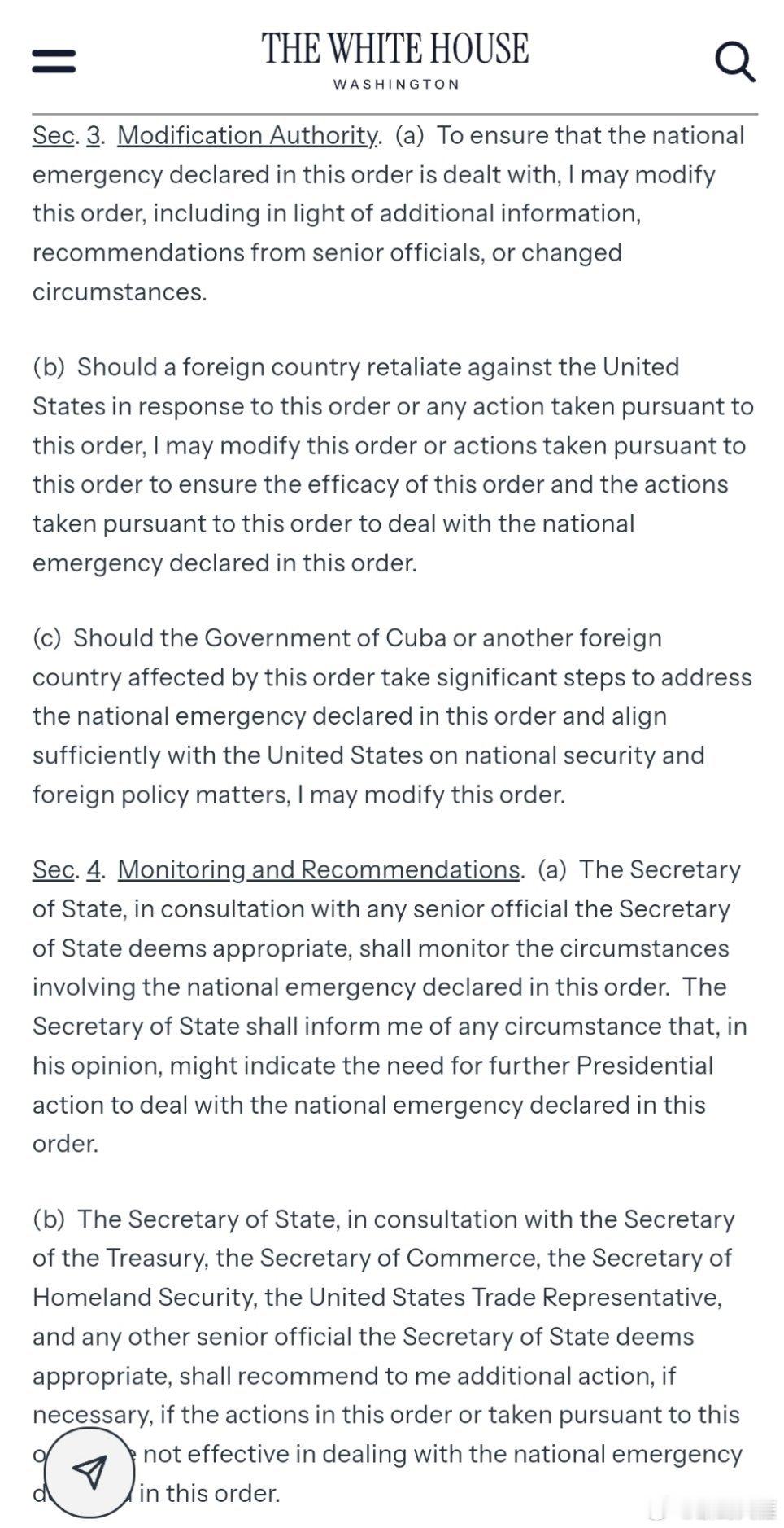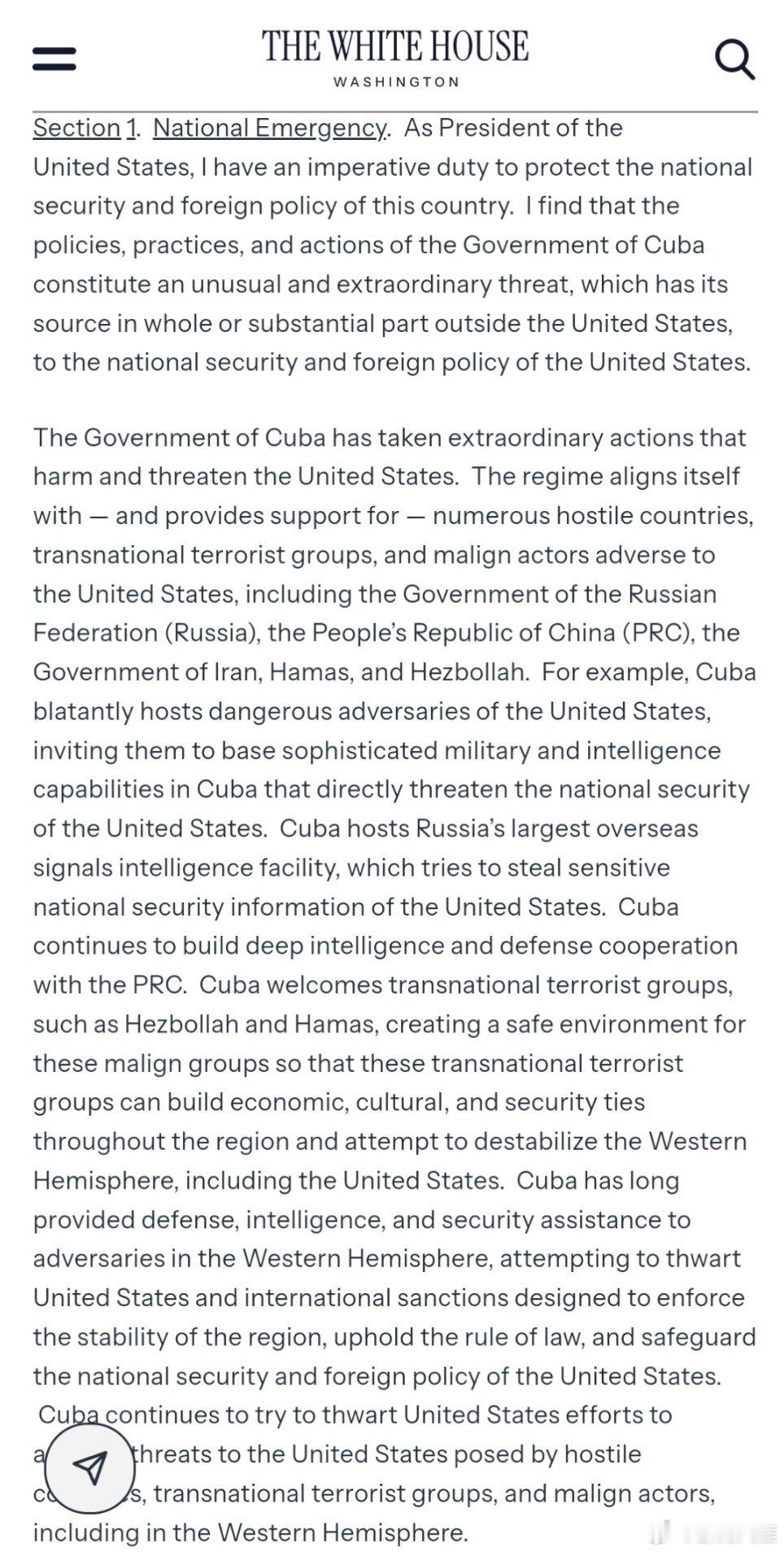 特朗普29日签署行政令,宣布国家紧急状态,威胁对向古巴提供石油的国家输美商品加征从价关税。(内容较多)(美官网)