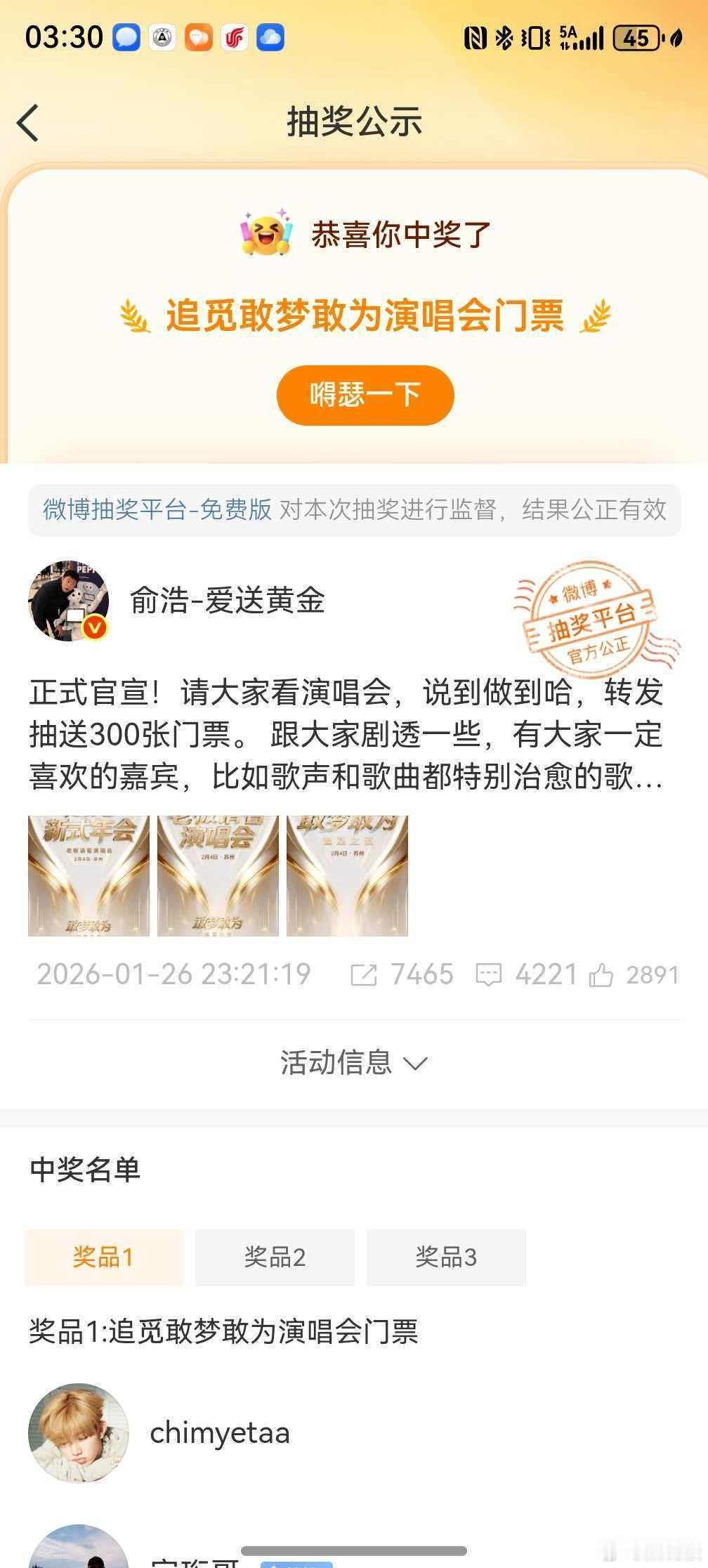 幸福来得太突然,抽中了送的演唱会门票,但我原本就要作为媒体去参加,所以多出一张门票,现在找一位在苏州粉丝,送出多余的一张门票