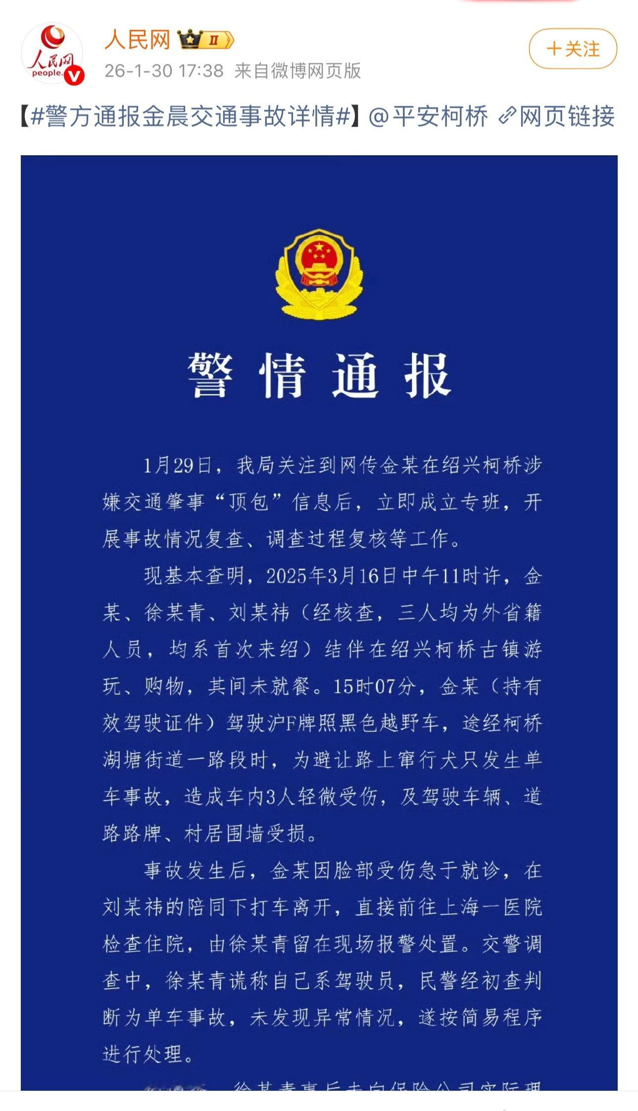 警方通报金晨事件:事故发生后金晨因脸部受伤急于就诊,把助理徐某青留在现场报警处置,助理徐某青谎称自己是驾驶员。事后徐某青未向保险公司实际理赔,不存在骗保行为。