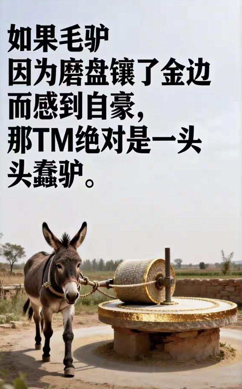 因为一头驴经常拉的磨被他的主人镶了一块金边,于是他见到别的驴就炫耀,而且还感到非常自豪。但是渐渐的别的驴就开始疏远它,而驴还自以为是的认为一定是自己比它们高一个档次,于是便骄傲的到处炫耀,直到有一天一个和它一起拉磨的驴给他说了一句话,他说“即使你用有镶了金边的磨盘,但你还是摆脱不了拉磨的命运,而镶了金边的磨盘只是主人炫耀的工具罢了”驴子听后颜面扫地,最后郁郁而终。这个故事所讲的道理,大家明白吗?驴 驴名场面 不要和驴计较 背部压弯的驴 毛驴驴肉 驴莊 高兴的驴