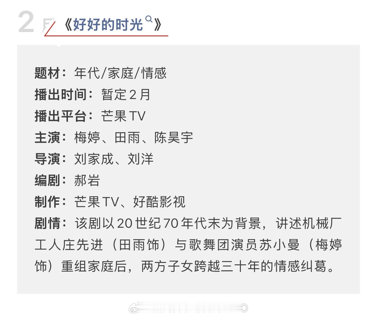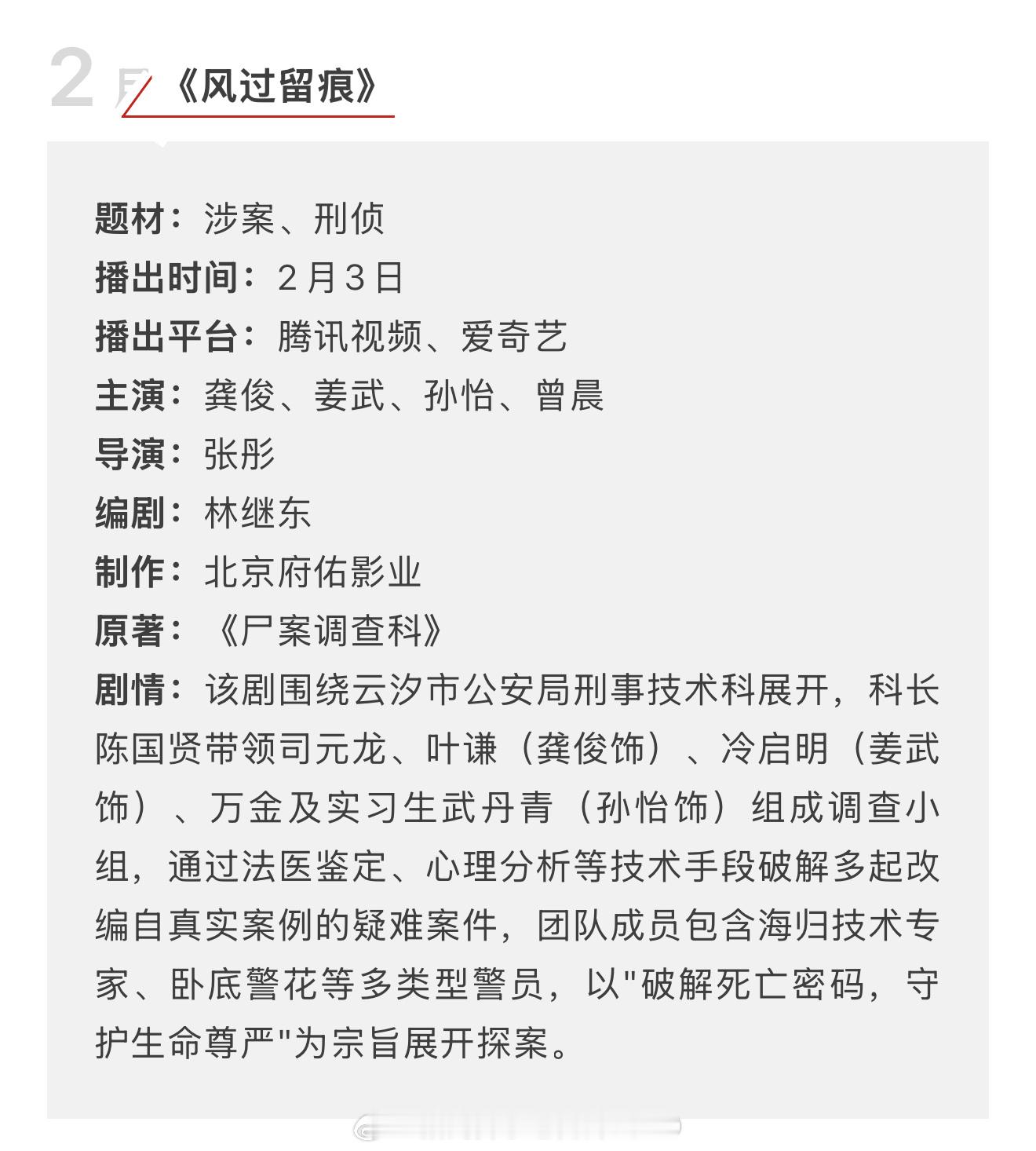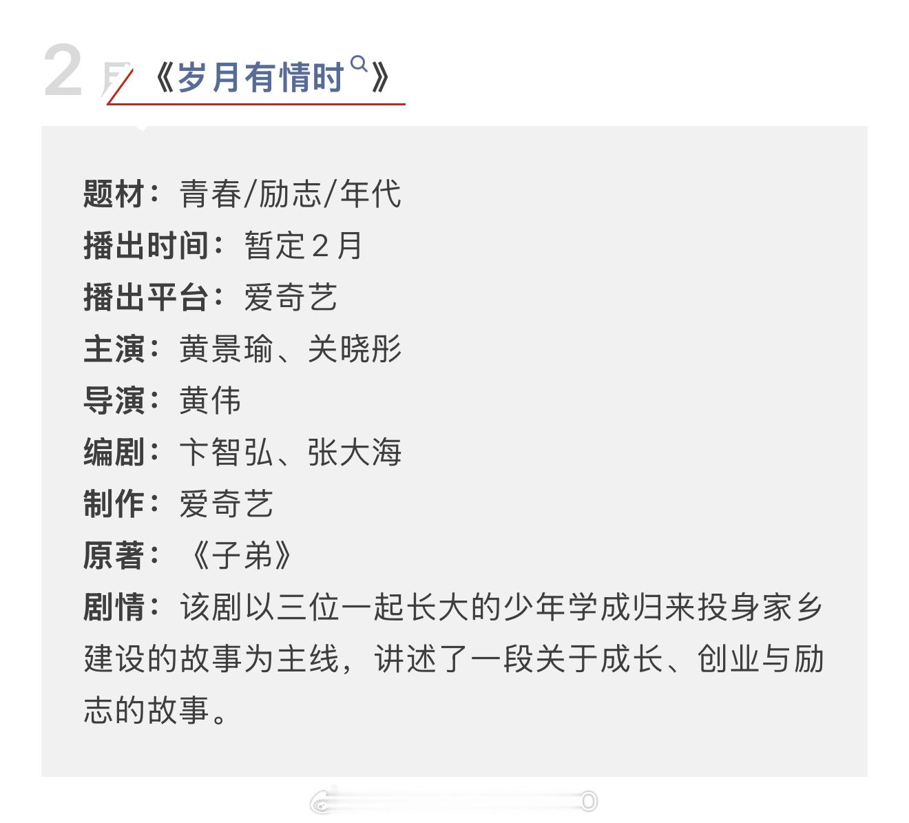 预计在2月播出的大剧:龚俊《风过留痕》2.3腾讯/爱奇艺周翊然、包上恩《江湖夜雨十年灯》腾讯陈飞宇、孙千《纯真年代的爱情》腾讯白鹿、王星越《唐宫奇案之青雾风鸣》优酷王楚然、丞磊《成何体统》爱奇艺黄景瑜、关晓彤《岁月有情时》爱奇艺梅婷、田雨、陈昊宇《好好的时光》芒果