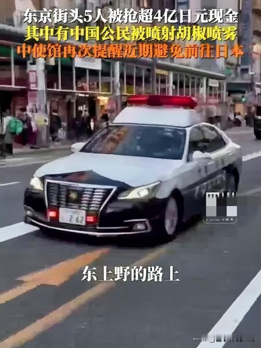 2026年1月29日晚,日本东京台东区发生一起巨额现金抢劫案,3名日本人和2名中国公民在将装有约4.2亿日元现金的行李箱搬入车内时,遭3名嫌疑人用辣椒喷雾袭击后抢走行李箱。同一时段附近,一辆汽车撞伤一名路人后逃逸,警方认为与劫案有关。中国驻日本大使馆已向日方交涉,要求尽快破案,并提醒中国公民近期避免前往日本。