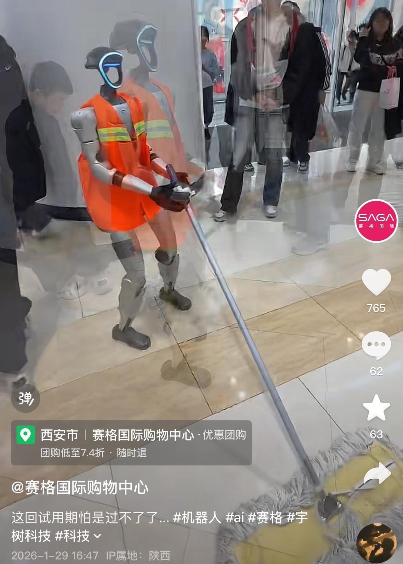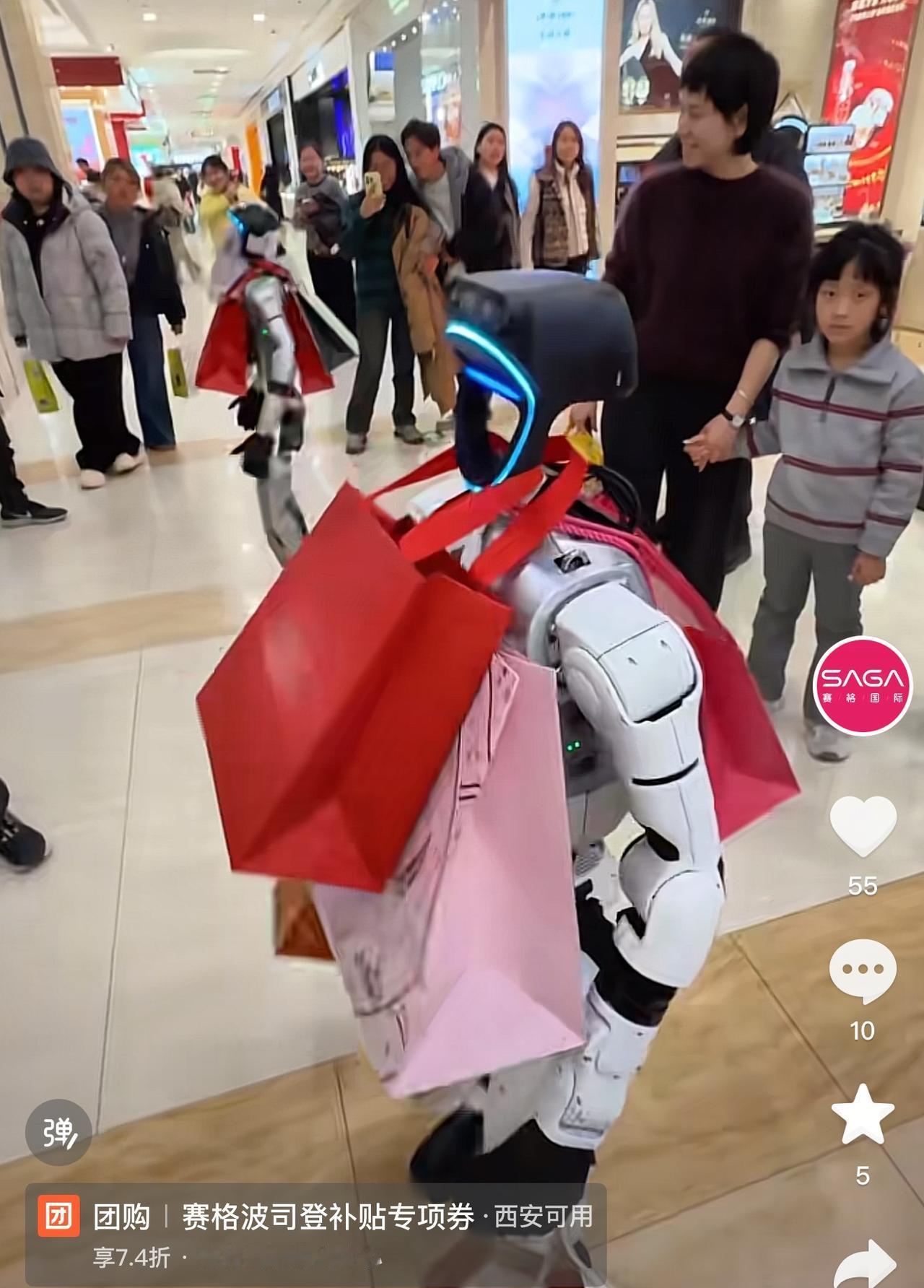 西安赛格国际这几天起猛了,在西安把势扎美了,在车库与营业厅到处是机器人! 车库里机器人指挥交通,营业厅里用拖把拖地,这些机器人还提着很多购物袋,见了顾客热情问候发放物品,这些又萌又可爱的机器人引来行人观看,赛格官方号一直推动机器人活动情况,太有意思了! 去赛格的人,可以让机器人帮助你提东西,估计以后走累了,机器人会背着你逛商场,快去赛格体验吧,太有意思了!