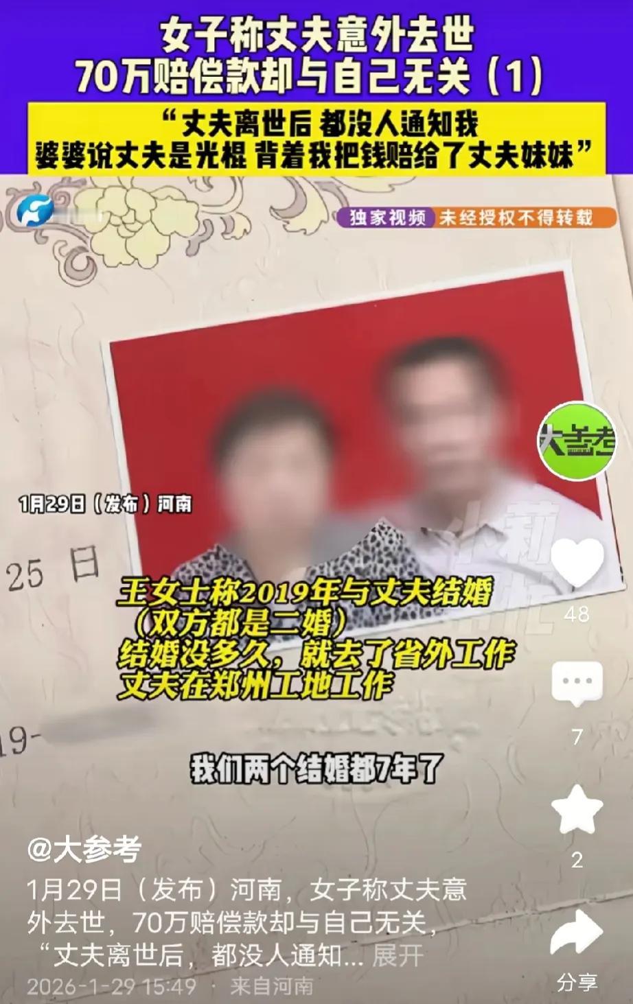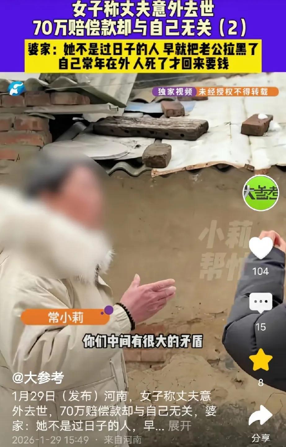 脸都不要了!河南洛阳,女子的老公出意外去世获赔70万,钱打到了小姑子和婆婆的卡里,女子知道后,立马跑回婆家撒泼滚打,女子公公:她男人在的时候,过年都不回来,户口也转走了,一联系就问要钱,男人死了,知道有钱就跑回来闹。网友:要钱不要 脸。 刘女士曾经有过一段婚姻,但因为种种原因,跟前夫分开了,刘女士离婚后,孩子跟了她。 2019年刘女士经人介绍,认识现在的老公王某,王某也是二婚。 两人领证结婚后不久,刘女士就把自己和孩子把户口转到王某家。 本以为,从此她能和王某好好生活,一起把日子过好。 没想到,刘女士没待几年就以打工挣钱为由,跑到外省。 刘女士出去打工不久就把她的孩子接走了,再后来就连她们的户口也迁了出去。 刘女士和王某的婚姻名存实亡,两人之间很少联系,刘女士偶尔给王某打电话,但是一打电话就是问要钱。 刘女士自从离开家后也很少回来,就连过年都不回来。 刘女士的做法让王家人心灰意冷,王某的父亲说,儿子就像一个单身汉,有老婆跟没老婆一样。 2025年刘女士把王某的联系方式也拉黑了,彻底不跟王某联系。 王家人以为,刘女士和王某算是玩完了,她一辈子都不可能再回这个家。 没想到,王某的赔偿金下来后,她却跑回来了。 还带着记者上门,刘女士委屈地对记者说,我老公在工地出意外死了,他们都没有告诉我,小姑子和婆婆去跟人家说,我老公是光棍,让工头把70万的赔偿款打到他们账户上。 刘女士说,她跟王某是2019年结婚的,他们是合法夫妻,按道理这个赔偿款应该是打到她账户上,但小姑子和婆婆却背着她偷偷领了。 刘女士希望小姑子和婆婆把钱还给她,可如今她们却连家门都不给她进。 记者听了也很同情刘女士,两人来到刘女士的公婆家,刘女士一看到她的公公就指着骂,她的公公看到刘女士也显得很激动,两人对骂着,互不相让。 记者看着剑拔弩张的两人,就对刘女士说,让她先在门外等,自己进去跟刘女士公婆沟通,等说通他们后,刘女士再进门。 刘女士答应了记者的提议,乖乖在外面等,可记者进到刘女士公婆家里后,她的公公却委屈地说,刘女士已经很多年没回家了,就连过年都不回来,她和她孩子的户口也转走了。 刘女士公公说,刘女士很少联系他儿子,一联系就问他儿子要钱,以前从不回家,现在儿子出事了,有赔偿款了,她就回来闹。 小姑子对记者说,她们不是不想让刘女士知道,而是根本联系不上她,她把电话都拉黑了,大家都以为这辈子她再也不回这个家,现在知道有赔偿款了,就跑回来了。 小姑子的老公在旁边气愤地说道,现在是有赔偿款,万一他是脑梗了、生病了,刘女士会不会回来送钱或者照顾她老公。 记者听了,表示理解王家人的做法,但是她说,刘女士跟王某毕竟是合法夫妻,是王某的法定继承人,所以这个赔偿款她也有份。 根据《民法典》1127条规定,配偶、父母、子女是法定第一顺序继承人,刘女士和王某是合法夫妻,就算户口迁走、拉黑联系方式,婚姻关系没解除,她就有分赔偿款的资格。 1130条规定,有扶养能力却不尽扶养义务的继承人,分配遗产时应当少分。 本案里,刘女士多年不回家、不照顾王某,一联系就要钱,最后还拉黑断联,完全没尽夫妻扶养义务,虽有继承权但只能少分。 王家父母是第一顺序继承人,常年陪在王某身边,小姑子虽不是继承人,但帮忙处理后事、联系不上刘女士才领钱,不算错。 70万赔偿款不是遗产,但分配参照继承规则,刘女士拿不到全部,大概率只分小部分,王家父母应多分。 刘女士真是典型的无利不起早,太让人不齿!婚内常年不回家,对丈夫不管不问,一联系就伸手要钱,最后干脆拉黑断联,半点夫妻情分没有。 丈夫意外离世,她不问伤痛只盯70万赔偿款,撒泼打滚要全款,嘴脸太难看。 虽说有合法婚姻在,但没尽过一天扶养义务,还好意思上门闹,要钱不 要 脸,这种人根本不配分一分钱! 对此,大家怎么看?