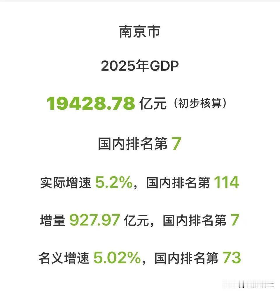 2025年南京市GDP数据公布,达到19428.78亿元,增量为927.97亿元!按照这样的增速,2026年有望突破20000亿大关!