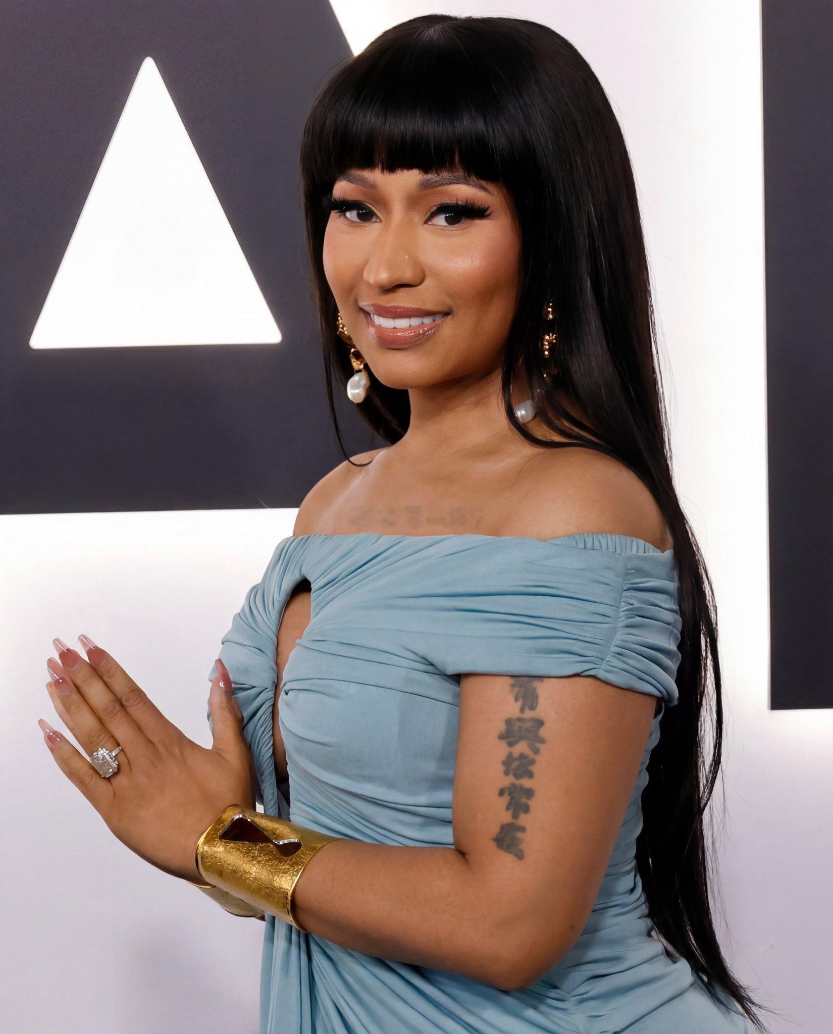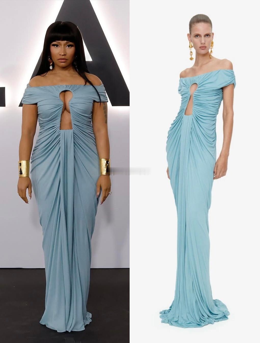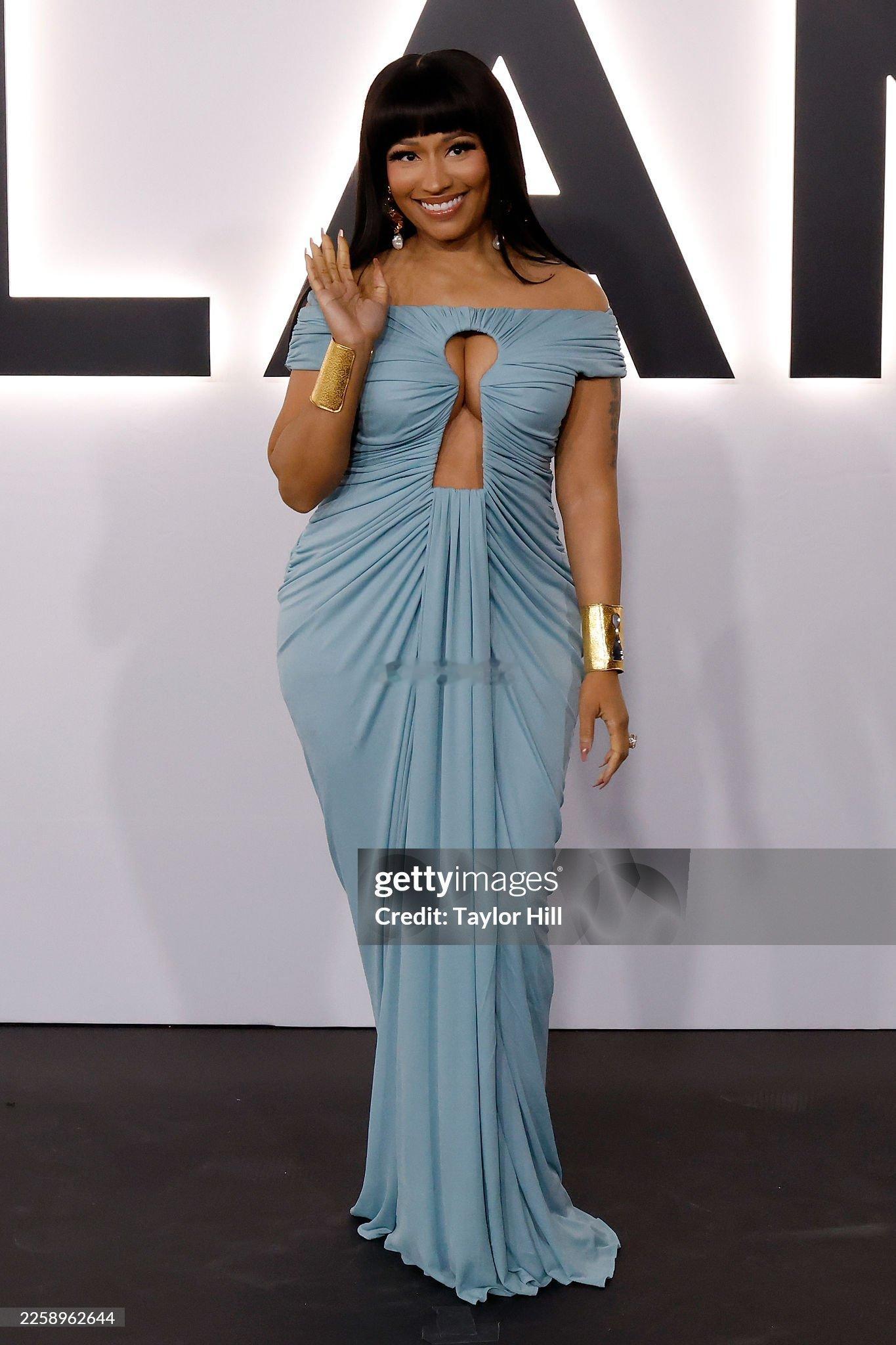 麻辣鸡Nicki Minaj身穿一条淡蓝色的Schiaparelli露肩褶皱礼服现身梅拉尼娅同名纪录片的全球首映礼👇