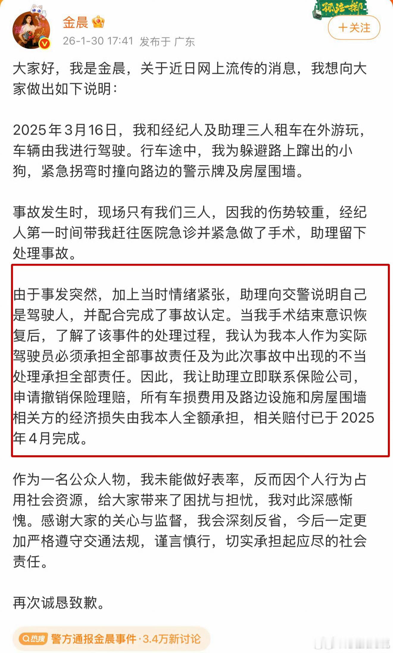 金晨道歉没有顶包挺好但是避让撞向警示牌和房屋围墙脸部受伤这么严重是没有系安全带撞方向盘了还是安全气囊出来了脸部这么严重?