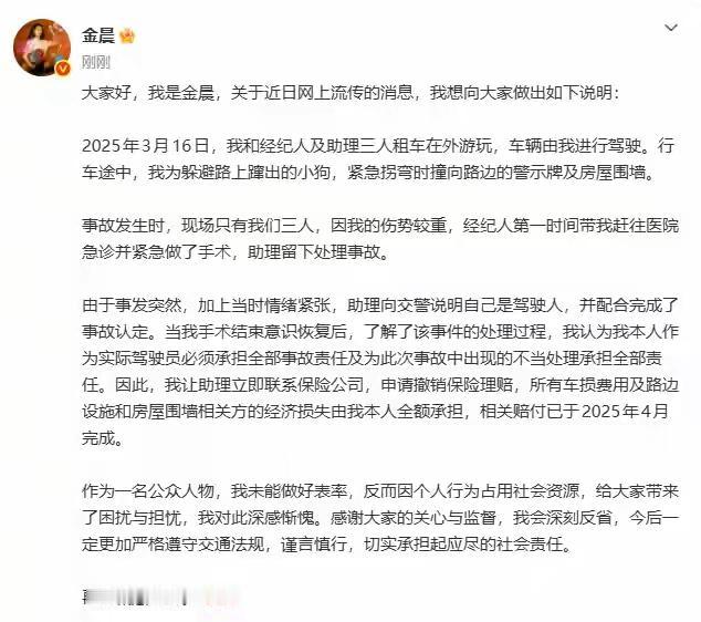 大家会原谅金晨吗? 金晨发文主要讲了三个重点: 1.承认她驾驶汽车载着助理和经纪人,为躲避窜出的狗撞上房屋围墙和警示牌。 2.她因为受伤比较严重,所以经纪人第一时间送她离开去医院做手术,留下助理处理后续事情。但是助理向交警谎称是自己驾车并完成事故认定。 3.金晨手术完成清醒之后,主动承担责任并联系保险公司撤销理赔,并赔偿相关的经济损失。 金晨的这次发文可以说文字相当的严谨,自己坦然承担,认识错误。不过,她是否因为受伤做手术才离开现场,还有疑问,尽管她发出来自己受伤的照片,但是这个还不是非常严谨的证据,为了让大家信服,应该公布就医手术的病历报告,或者相关的照片。如果,她能够提供这些证据的话,就证明她说的是真的。