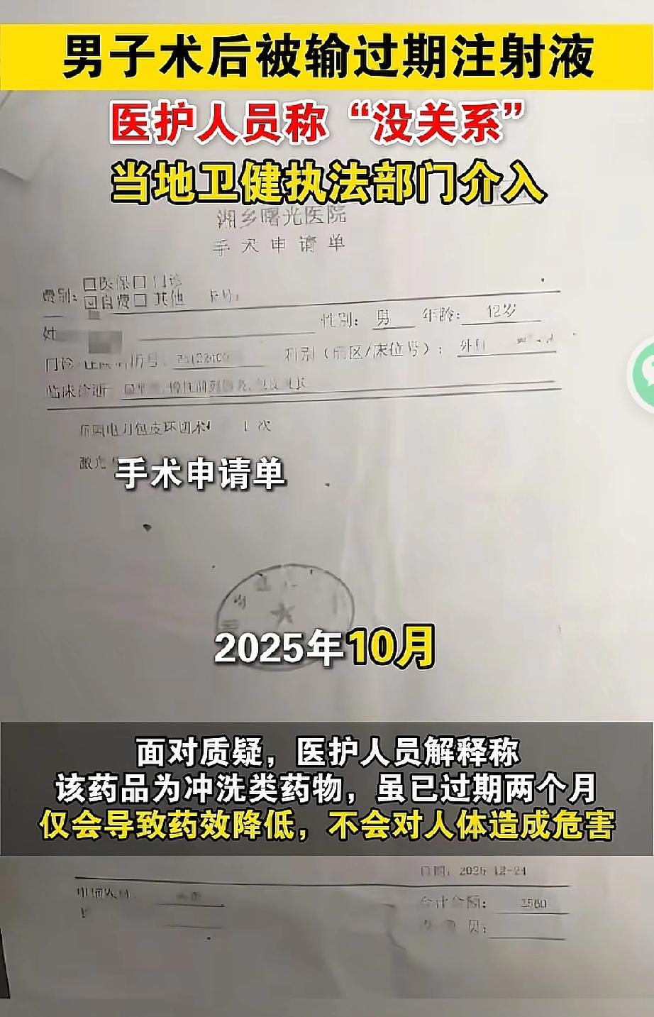 太离谱了!湖南周先生做包皮环切手术后输液,怕药输完了没发现,抬头一看,无意间发现药袋已过期近2个月,赶紧告诉护士,却被轻描淡写说“没危害,直接喝都没事”。 周先生中学时就知道自己包皮过长,当时年纪小没当回事。后来一次体检,医生好心提醒他,趁结婚前赶紧做环切手术,不然可能影响后续生育。可周先生工作一直很忙,做手术得休养一阵子,这事就一拖再拖。 前阵子,他实在觉得不能再拖了,硬着头皮向公司请了假,去当地一家医院做了手术。手术过程挺顺利,术后医护人员就按流程给他输液消炎。 周先生躺在病床上不敢乱动,无聊地玩着手机,怕药输完了没及时发现,就抬头看了一眼输液袋,这一看可把他吓出一身冷汗! 药袋上写着生产日期是2023年11月27日,过期日期是2025年10月,可当天是2025年12月,这袋药已经过期快2个月了! 周先生赶紧喊来护士,把情况一说,万万想到,护士一句:“不用担心,这药没危害,就是用来冲洗血管的,哪怕直接喝下去都没事,顶多药效差一点。” 周先生听得懵懵的,也没敢反驳,只能按护士说的输完了液。可之后两天,他越想越不对劲——要是过期药真没风险,为啥要标过期日期呢?越琢磨心里越膈应,后来身上还出现了痒痒的症状。 不放心的他赶紧去大医院检查,幸好医生说身体没大碍,这才松了口气,但他还是把这事反映给了有关部门。 过期了怎么可能没事?面对质疑,医护人员的反应更耐人寻味——不是紧急处理,不是诚恳道歉,而是轻松地表示“喝了都没事” 这种态度暗示着,他们可能早已习惯了这种“差不多”的安全标准。 按照医疗规范,这种过期药品根本不应该出现在药房,更不可能被送到患者床边。但它就是出现了,平静地、毫无障碍地进入了最关键的用药环节。 想一想:一袋注射液要经历多少环节才能到达患者手中?采购、验收、入库、存储、定期检查、发放、核对、使用……只要有一个环节认真履职,过期药品就不可能被使用。 我们去医院是为了治病养病,不是去冒风险的。药品的保质期可不是随便标的,是保障用药安全的底线,过期药品可能药效失效,还可能变质产生有害物质,周先生刚做完手术,身体正虚弱,输过期药的风险更是翻倍。 医护人员本该是守护健康的“白衣天使”,可这位护士不仅不重视过期药品的危害,还拿不负责任的话敷衍患者,这种态度比过期药更让人寒心! 医疗无小事,药品安全更是重中之重,医院必须把好药品采购、储存、使用的每一道关,医护人员也得有责任心,对患者的生命安全负责。 希望执法部门能严查到底,让涉事医院和医护人员付出应有的代价,给周先生一个交代,也给所有患者一个安心的就医环境。别让“治病”变成“添堵”,更别让医院的安全底线,毁在粗心和敷衍上!