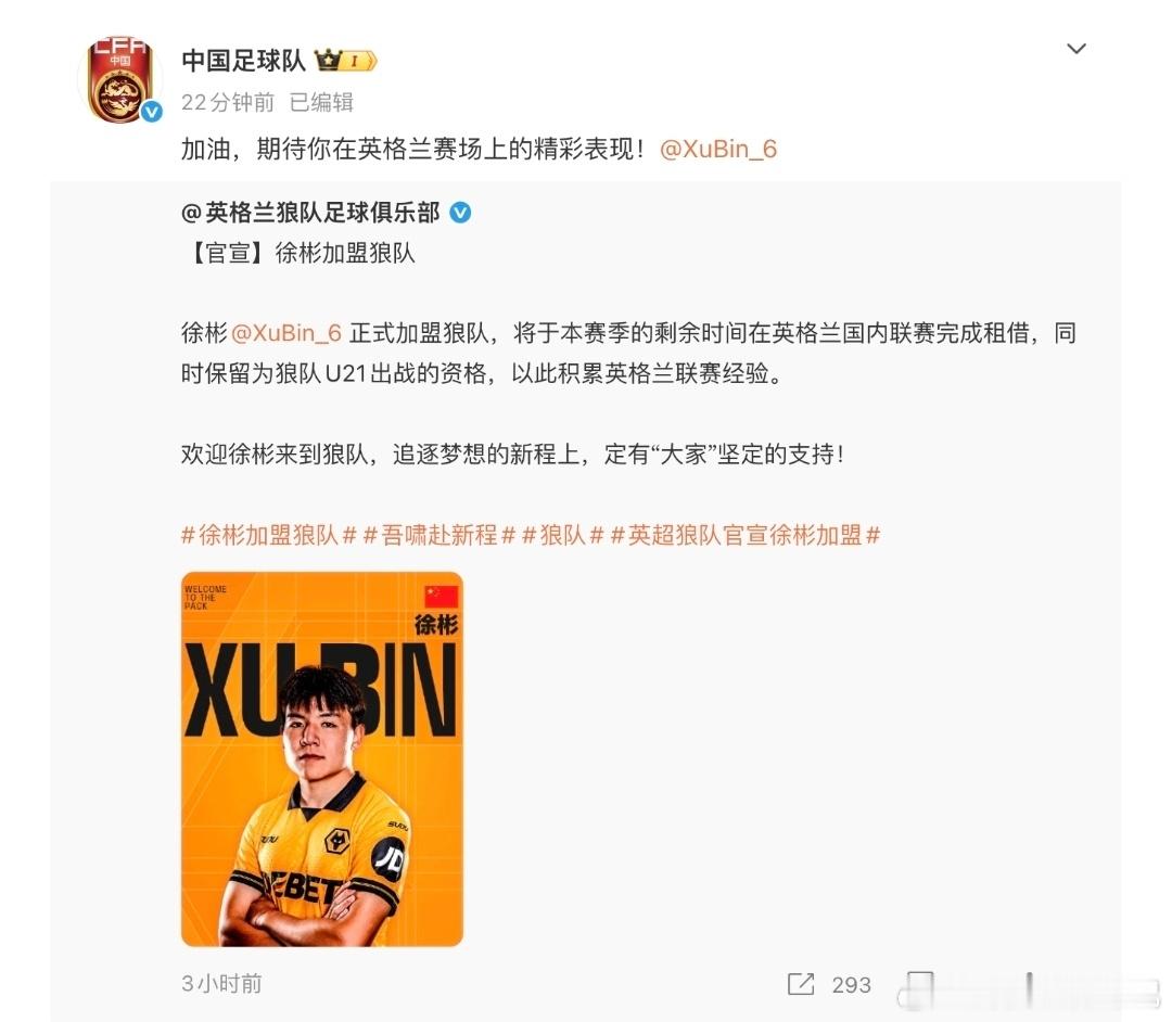 国足官方发文祝福徐彬:期待你在英格兰赛场上的精彩表现!稍早时候,狼队官宣中国U23队长徐彬加盟球队,随后中国足球队官方转发狼队官方公告并祝福徐彬,“加油,期待你在英格兰赛场上的精彩表现!”