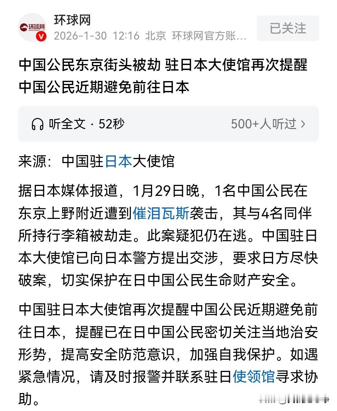 咱们国家已经苦口婆心的一次又一次的提醒国民了,不要去日本,不要去日本。 因为现在日本国内的治安情况真的不好,而且反华的情绪正在抬头。 再加上日本那个地方多雪灾,多地震,多火山爆发,多海啸。 那就不是一个善地,但是依然有人不听。 最新消息,2026年1月30号,中国驻日本大使馆再次提醒中国公民,近期一定要避免前往日本。 为什么这么说呢? 咱们大使馆微信公众号已经发文提示了。 1月29日晚间,一名中国公民在东京上野附近遭到了催泪瓦斯袭击,他跟4名同伴所持的行李箱被劫匪抢走。 目前嫌疑犯仍然在逃。我国驻日本大使馆已经向日本警方提出了交涉,要求日方尽快破案,切实保护在日中国公民生命财产的安全。 这个案子确实很复杂。 29号晚上9:30左右,东京都台东区东上野的路上,有三名日本籍和两名中国籍共5人。 拎着三个装有现金的行李箱,准备进入汽车。 就在这个时候,突然冲出来三人的团伙。 他们用催泪瓦斯袭击这5个人。 然后迅速抢走了装有现金的行李箱。 据东京警视厅介绍,这些箱子里面一共装了4.2亿日元。 折合人民币1,894万! 而这三人团伙在抢劫现金之后开车又撞倒了一名50多岁的日本路人,然后逃离现场 日本警方确定,这是三人团伙抢劫之后又肇事逃逸? 你以为这只是孤立的案件吗?当然不是 就在同一天,羽田机场停车场,一名携带装有1.9亿日元拉杆箱的男性拨打报警电话 他表示自己被催泪瓦斯喷射 有人企图抢劫他的钱财,但是由于他的抵抗,钱财并没有被抢走 由于当时引发了周围人的注意,所以这三个人的团伙没有得手,便驾车离开了 日本警视厅认为,这两起案件都是同一个团伙所为 毋庸置疑,这应该是踩点之后的一次蓄谋作案 有媒体反映,案发现场周边是非常繁华的商业区 这里有很多的珠宝商店,以前也发生过抢劫案 按照目前的消息分析,被抢走的现金应该是合法收入 因为中国公民加上当地的日本人,第一时间就报警了 说明他们对自己的现金还是非常有信心的,这是合法所得,应该不是非法所得 而且在短短不到三个小时之内,就发生了两起劫案,这一团伙实在是太嚣张了 不排除有内鬼对外透露一些情报 咱们的大使馆已经发布了紧急的提醒,明确建议中国公民近期一定要避免前往日本 在日的日本华人,一定要避免深夜出行,一定要避免携带大额现金 要加强自我保护 这个案件还怎么说呢,没什么可说的了 好良言难劝该死的鬼 日本的经济越衰弱,犯罪率也就会越高 正所谓穷山恶水出刁民啊 如果日本的经济处在一个高速发展的阶段,大多数民众都有工作,而且收入都很高的话 那么你就不用担心犯罪率了 可是现在已经不是那个阶段了 穷则思变,穷则思乱,甚至穷生奸计 如果心净没有记错的话,国家应该是连续三次发布提醒了 如果这样还是不能喊醒那些人 春节期间照样还有一批人往那边跑 那么我建议国家就不要管他们的死活了 自己承担自己的命运吧。 最后多说一句,有一句俗话说,不作就不会死 日本当地时间1月25号就出了那么一件,让人无奈的消息 有6名中国游客,被困在日本八海山的死亡谷的野雪区里面 什么叫做野雪区呢? 就是不在人家正规滑雪场地之内,你擅自跑到了滑雪场地之外,这种行为叫做滑野雪。 结果这6名中国的游客全都被困在了大雪之中。 当天下午3点和他们同行的朋友发现已经找不到他们了,赶紧报警,并在咱们国内的社交网络上发帖子寻求救援。 最后还是咱们中国驻当地的总领事馆反应足够快,一看到网上的求助,立刻介入,马上要求日本警方帮忙寻找。 足足折腾了20多个小时,一直折腾到了26号上午11点。 这6名中国游客终于在雪窝子里面被救出来了。 这6个人里面有5名咱们大陆的人,还有一位是台湾人。 最后日本的救援队也不可能白救你啊,然后开出了价格,每个人100万日元。 不要指望日本的救援队会白救你,一个人100万日元。 这就是救援费用。 也就是说一个人的救援费用是5万人民币。 这还说什么呢?有什么好说的呢? 人家要你就得给呀,在咱们国内,他们肯定会道德绑架的,但是到了日本,一个一个老老实实全都把钱交了。 你说这件事怪谁? 国家提醒你了,不让你去,你非得要去。 你去了也不遵守规则,人家有正规滑雪场,你不滑。 非得跑到滑雪场之外去滑野雪。 一点规则都不想遵守。 真的无法想象,咱们国家这些年怎么养出了这么一群反骨仔。 就是不肯遵守规则,越劝他越来劲。 你以为一人交了5万块钱,他们就会吸取教训吗? 不会的,他们认为自己有的是钱。 他们根本就不在乎这几万块。 您说怎么办?没法办,就让他们自生自灭吧。 其实这件事情多亏了当地的领事馆出面了,如果没有咱们外交部门的跟进。 你以为日本的警方会在大雪纷飞的时候派出救援队吗? 您真的以为他们会玩命的救你的命吗? 好好想想吧。 当然了,那些人是不会感恩的,他们这次侥幸逃出生天,只会纵容他们下次再次冒险。