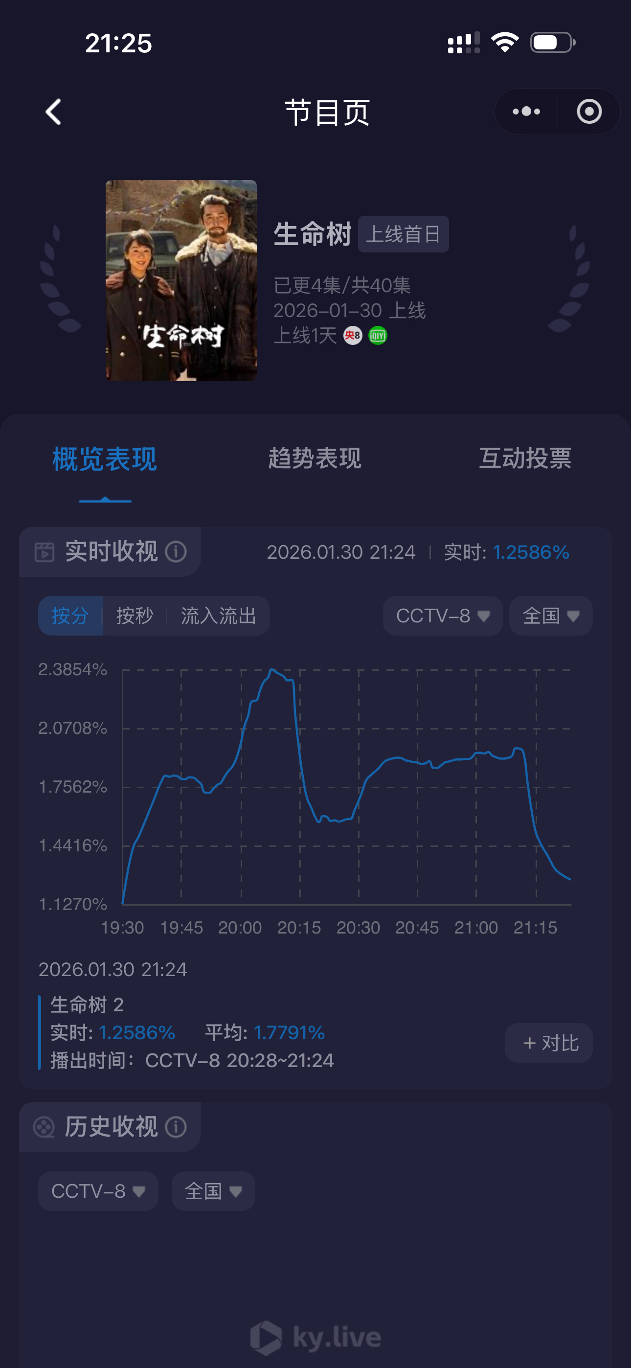 看酷云收视率表现也很差,第二集低位横盘,两集集均1.803,甚至不如央八前作小城大事(首日2.234)