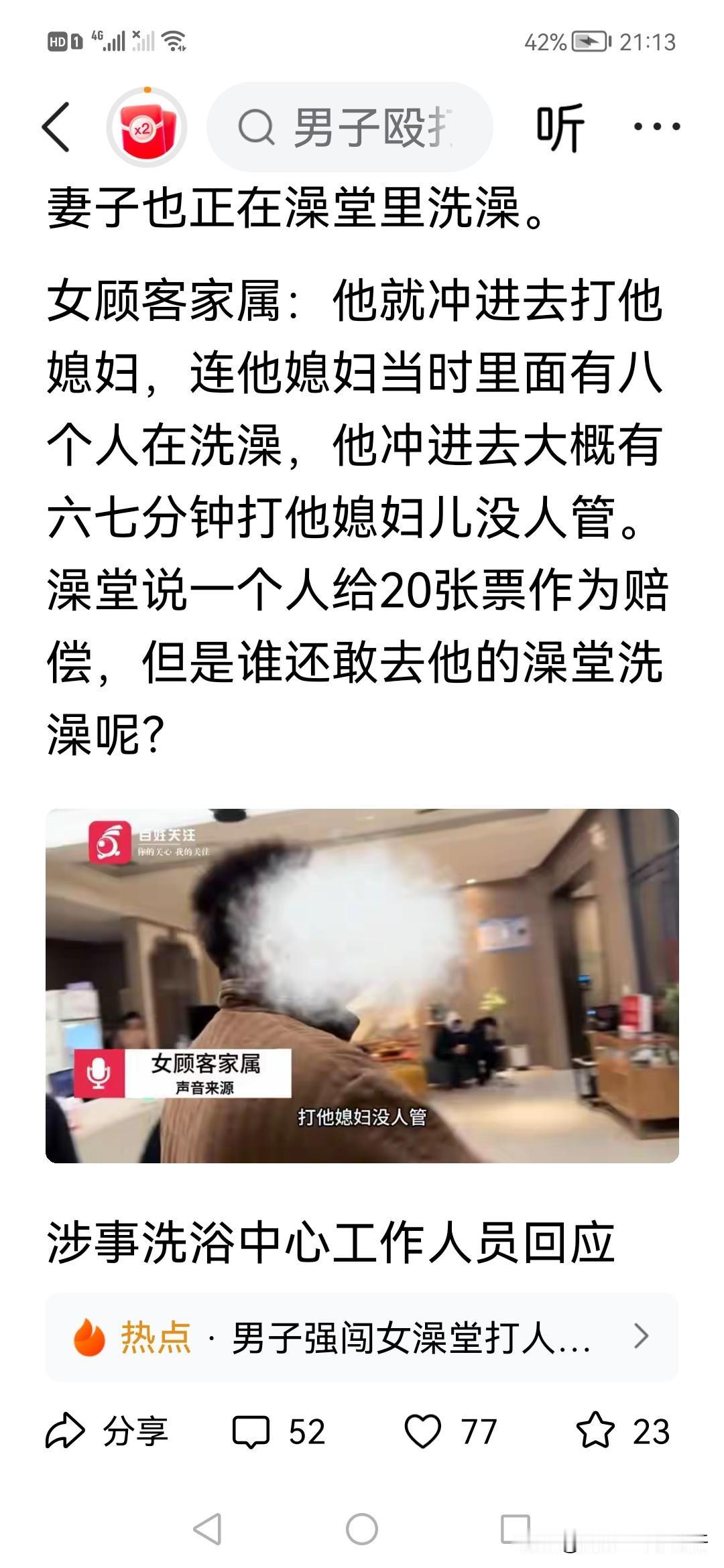 男的闯入女澡堂打老婆 天下奇闻!澡堂同时还有八个女客人在洗澡,这八个客人不是穿着衣服洗澡的吧。那就是八个春光都泄露给强行闯入的男的了! 行为不算特别凶残,但是真够恶劣的! 最起码的基本道德也是有别的女人光溜溜洗澡男的都不好意思往里去吧,这个似乎不咬人膈应人!我都找不到刑法里哪条适合他! 危害公共安全?涉嫌猥亵?哪个都不贴,还得专业法律人士来贴标签! 对澡堂来说也是无妄之灾,其实一般有稀里糊涂走错的,喊一声就会不好意思的转身,这个强行闯入的,一般前台女店员也拦不住啊? 估计以后去公共澡堂洗澡都得裹着毛巾[捂脸],反正我不太习惯去公共浴室,我不习惯让别人欣赏,同性也不行[笑哭]。 据说澡堂赔付女浴客二十张澡票,还有人敢要吗? 想起一个滑稽的问题,这个男的咋准确找到自己老婆的? 打老婆打的真没底线了?这是多大的瘾啊?