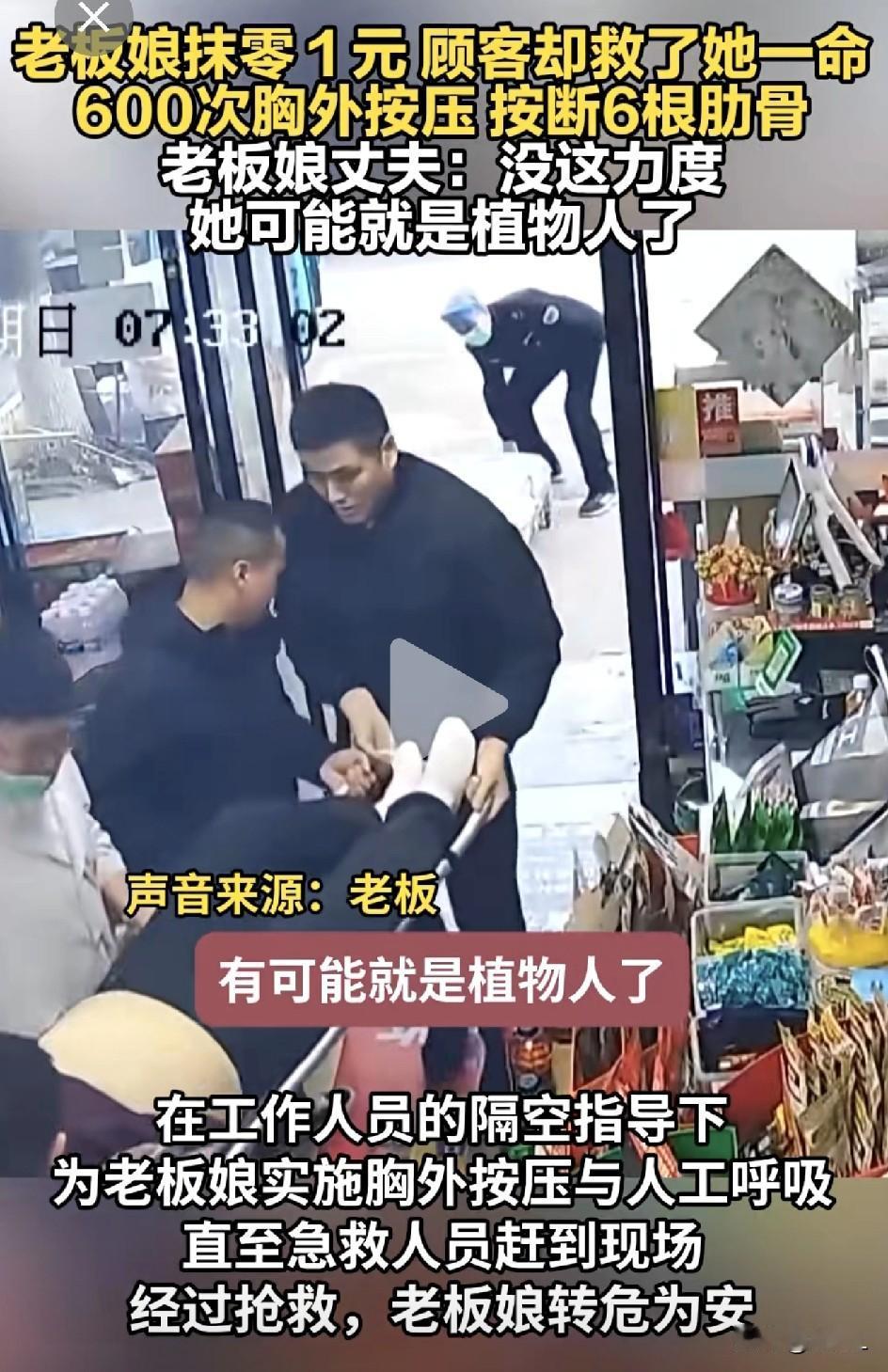 只因为1块钱的免单,换回了600次按压,6根肋骨断裂……超市里的生死5分钟。老板:这份恩情,要记一辈子! 江苏苏州一家小超市内,买烟的顾客付款时,因老板娘好心抹掉1块零头,两人多说了几句话,让顾客多在店里驻足几秒钟。 恰恰就是因为这几秒钟,买烟的顾客转身就成急救员,电话那头的调度员隔空指挥,硬是按断老板娘6根肋骨,才从死神手里抢回一条命。 2025年年底,张先生去超市买烟。结账时老板娘说“1块钱算了”,俩人笑着多聊了两三句。话音没落,老板娘突然直接栽倒在地,没了呼吸心跳! 张先生头皮一麻,马上打120。电话接通,调度员的声音像定心丸:“听我说,现在开始按压胸口,跟着我的节奏来!” 张先生跪在地上,按照指示一下、两下……老板娘还是没反应。“现在做人工呼吸!”调度员继续指导。张先生没犹豫,捏开嘴就吹气。 当急救车呼啸赶来时,张先生浑身湿透,手抖得停不下来。医生一检查:颈动脉没了,呼吸停了!赶紧接力抢救。 最后,送医院一查——肋骨断了6根,但老板娘得救了! 老板却红着眼睛说:“按不断肋骨,力度就不够,人就可能成植物人了!这恩情,一辈子还不完。” 最让人心疼的是张先生事后那句话:“救人时啥也没想,救完了才怕——怕人没活过来,家属讹上我。” 他打完120就立刻报警备案:“警察同志,我救了个人,你们帮忙找找家属。”——这年头,好人也得留个心眼。 如今老板娘已经康复出院。 这场意外里,有陌生人的毫不犹豫,有调度员的专业冷静,更有家属的深明大义。 肋骨断了能长好,人心冷了难再热。 给临危不乱的张先生点赞,也给每一个在危急时刻伸出援手的人撑腰:法律有规定,救人免责! 咱该出手时就出手,别让那一丝犹豫,误了一条命。 素材来源:新华日报,侵联删! 带定位晒今日生活 我的今日状态:💰期待暴富 我这里的天气:☀️晴天